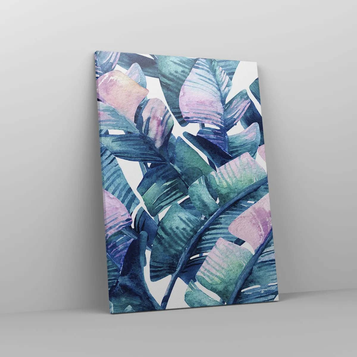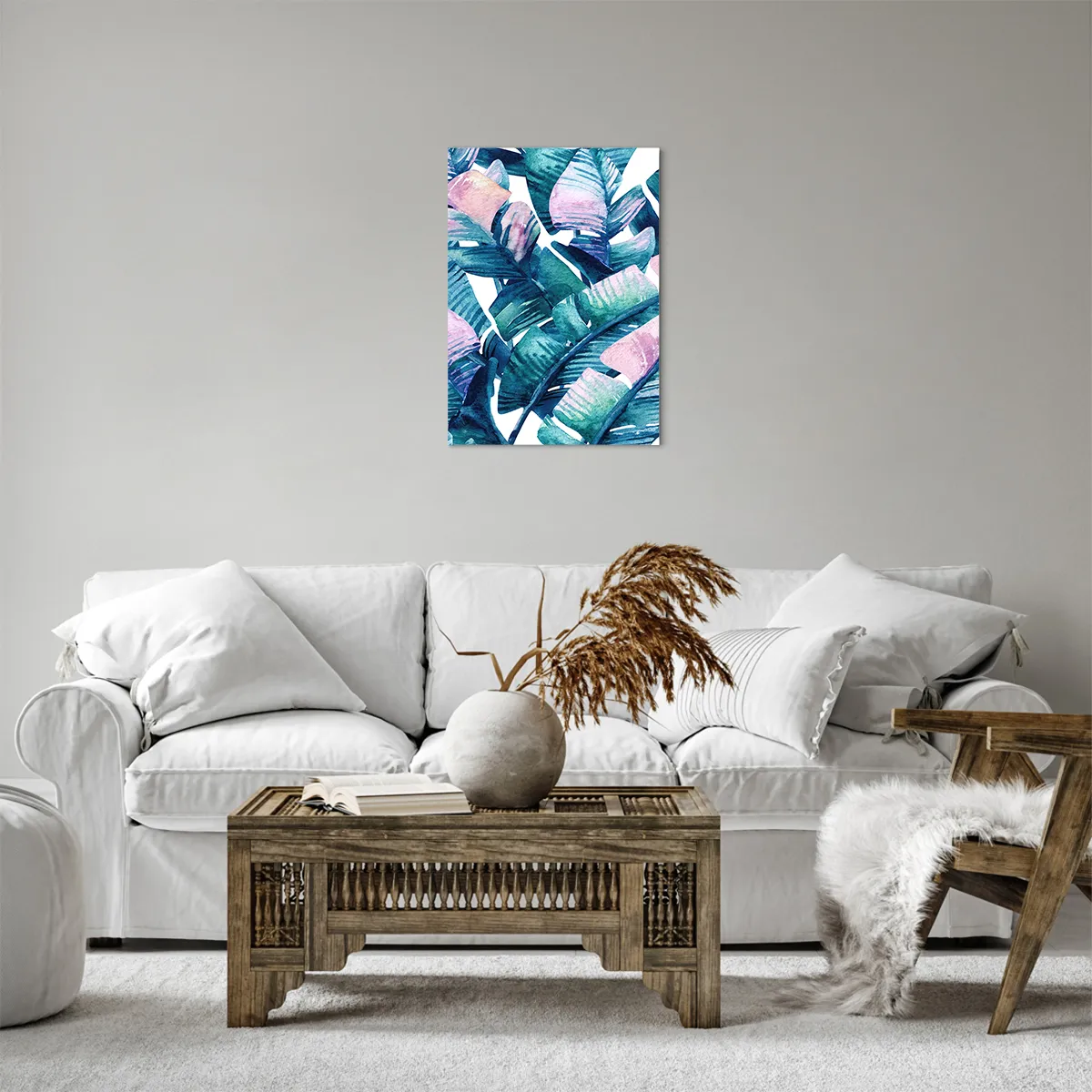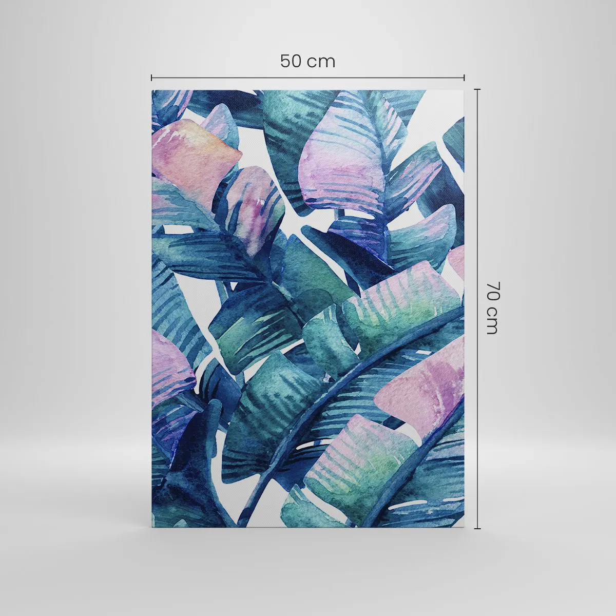 Bild auf Leinwand - Leinwandbild - Bananenblätter in Blau- und Rosatönen - 50x70cm - In einem Bananenhain - Moderne Wanddekoration für Wohnzimmer und Schlafzimmer ARTTOR