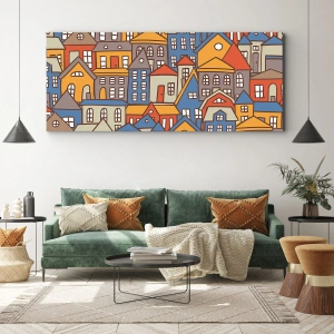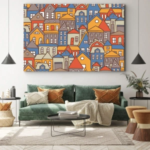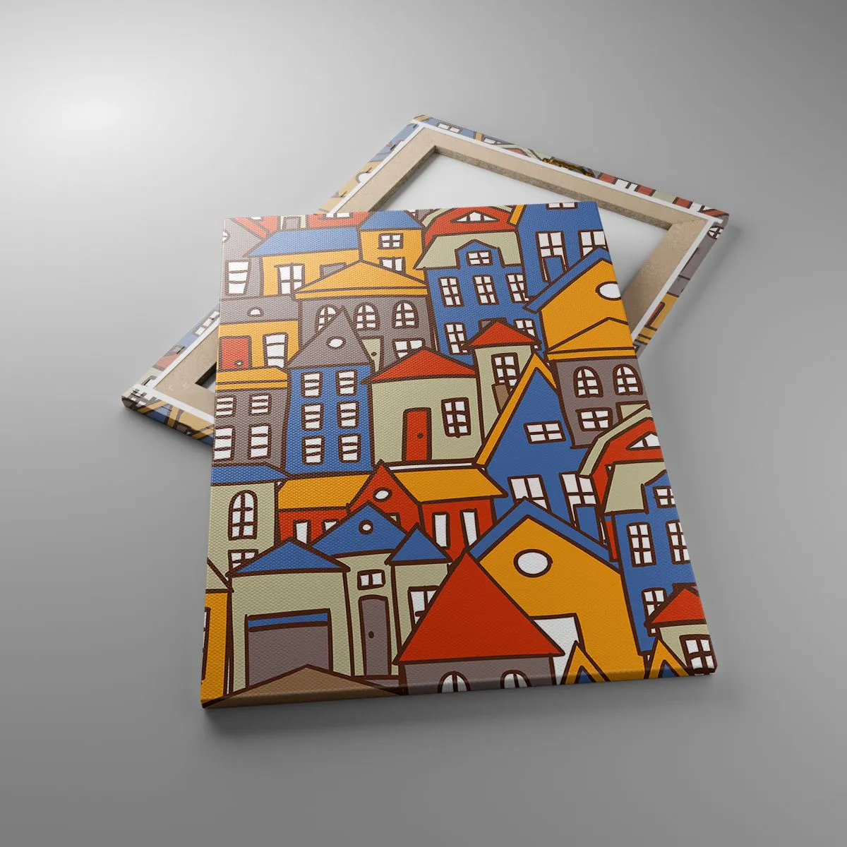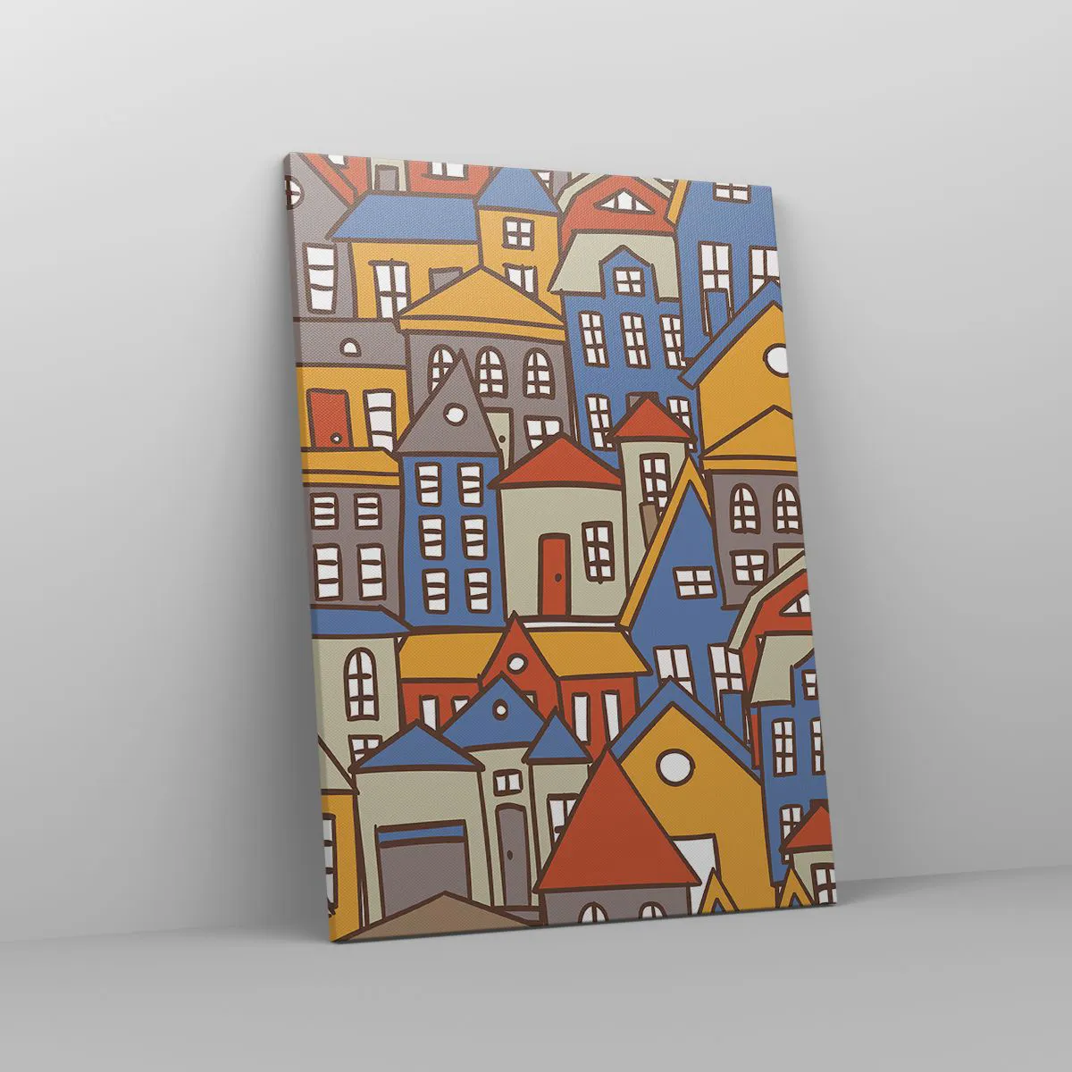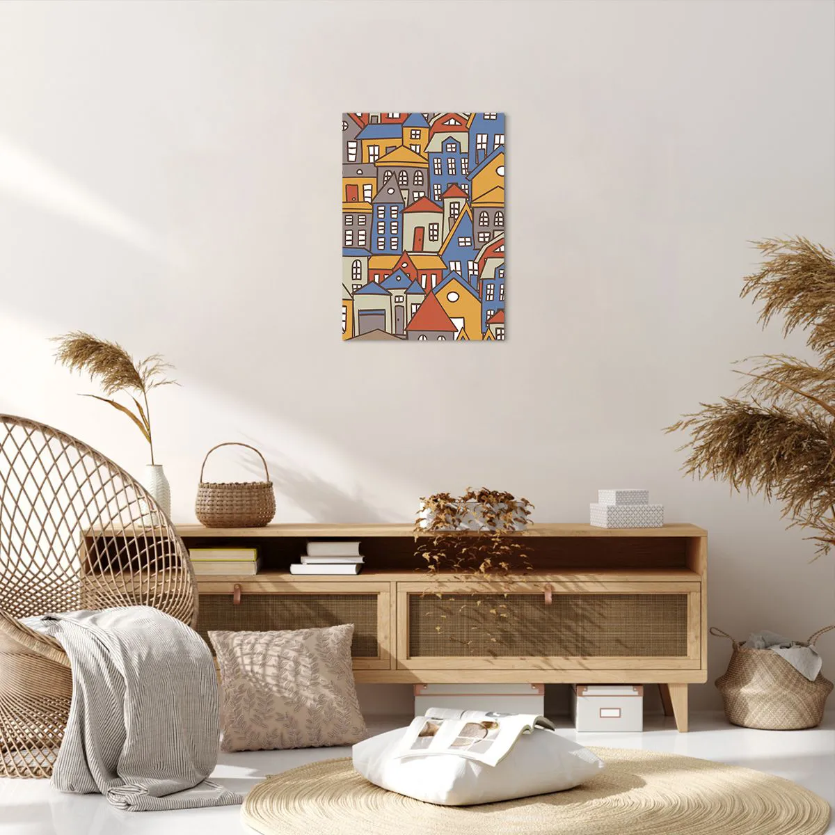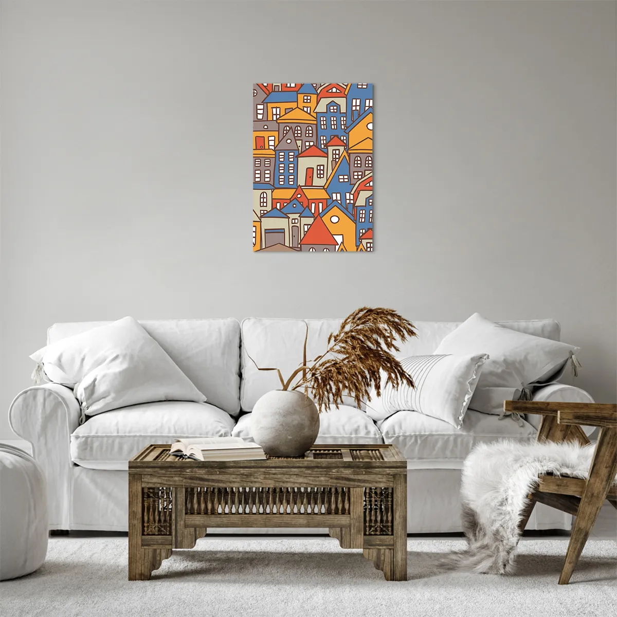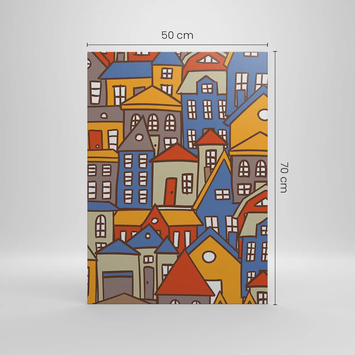 Bild auf Leinwand - Leinwandbild - Bunte Häuser im grafischen Stil auf hellem Hintergrund - 50x70cm - Hinter dem Haus ist das Haus - Moderne Wanddekoration für Wohnzimmer und Schlafzimmer ARTTOR