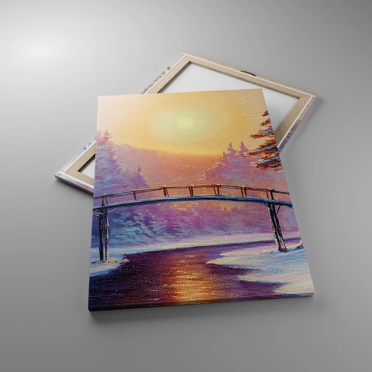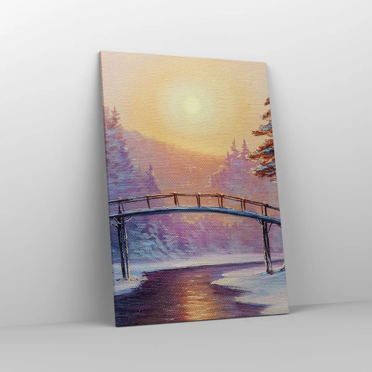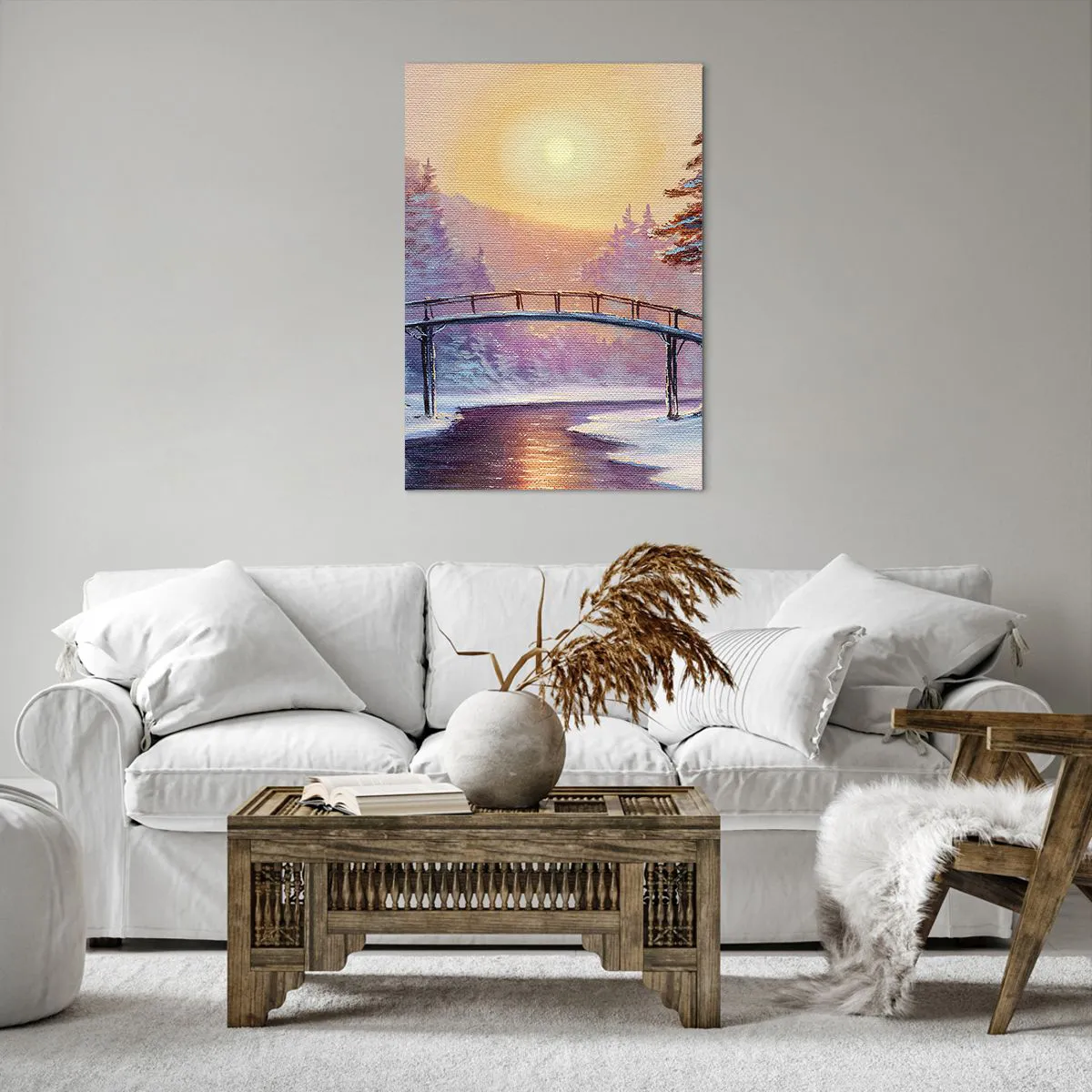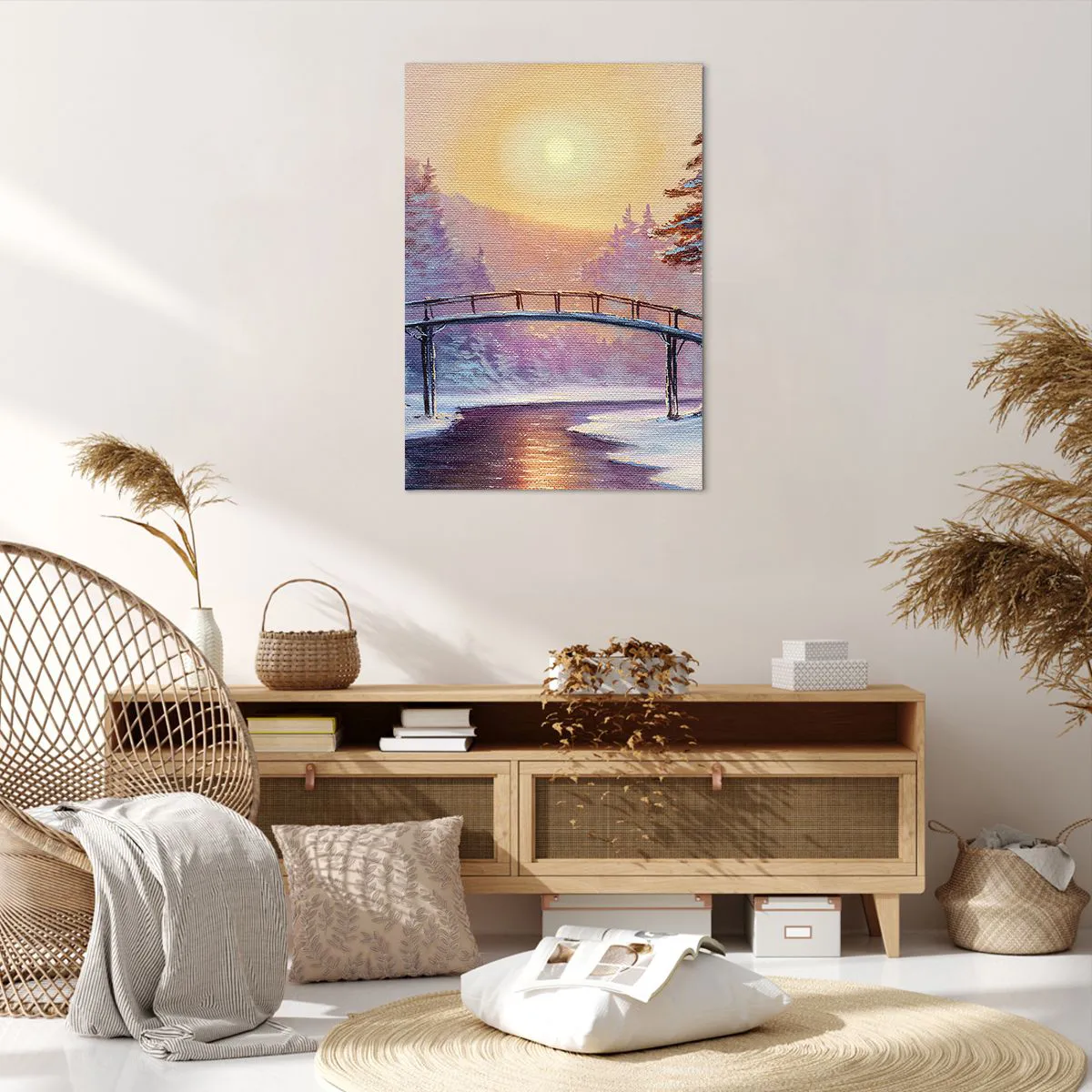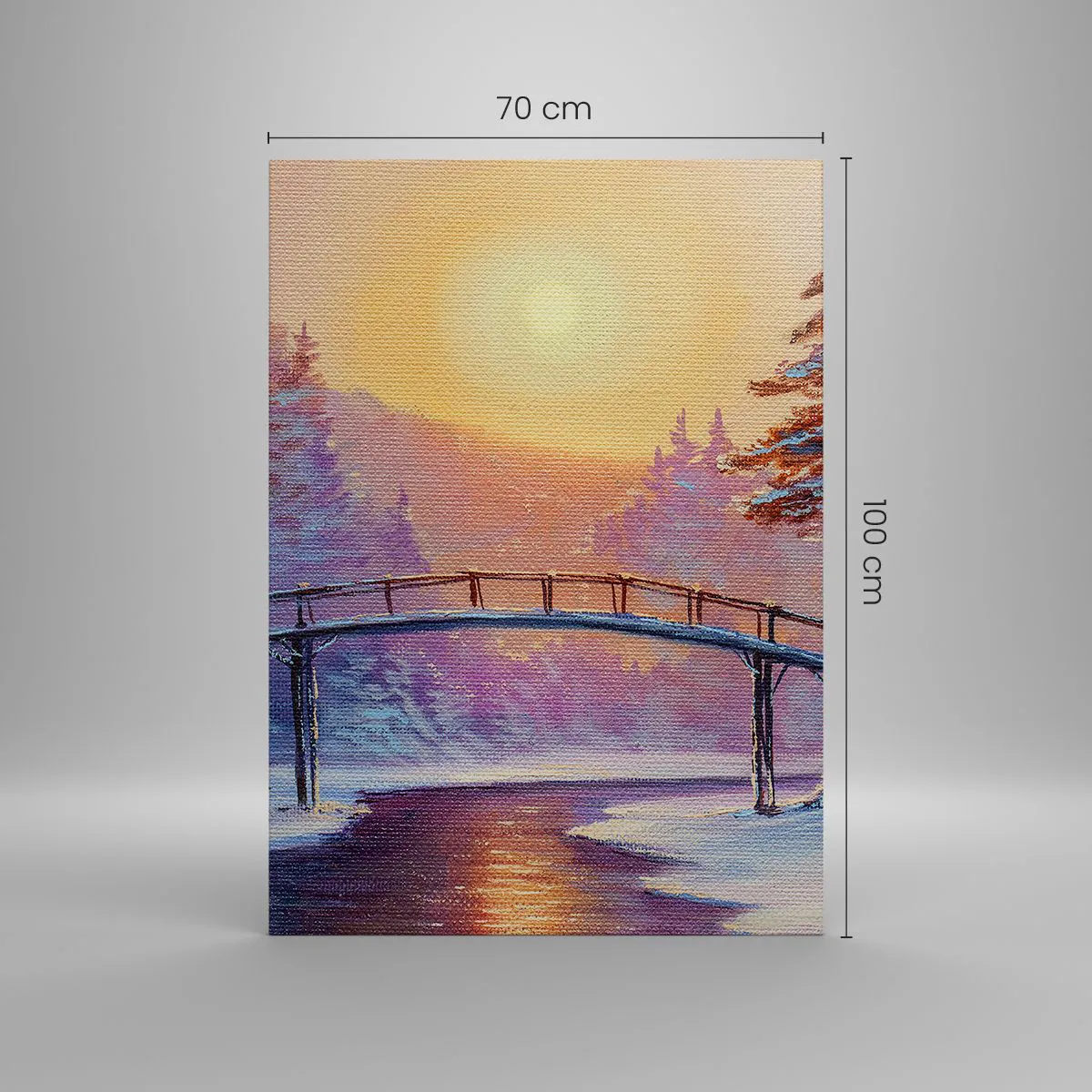 Bild auf Leinwand - Leinwandbild - Winterlandschaft mit einer vom Sonnenuntergang beleuchteten Brücke - 70x100cm - Vier Jahreszeiten - Winter - Moderne Wanddekoration für Wohnzimmer und Schlafzimmer ARTTOR