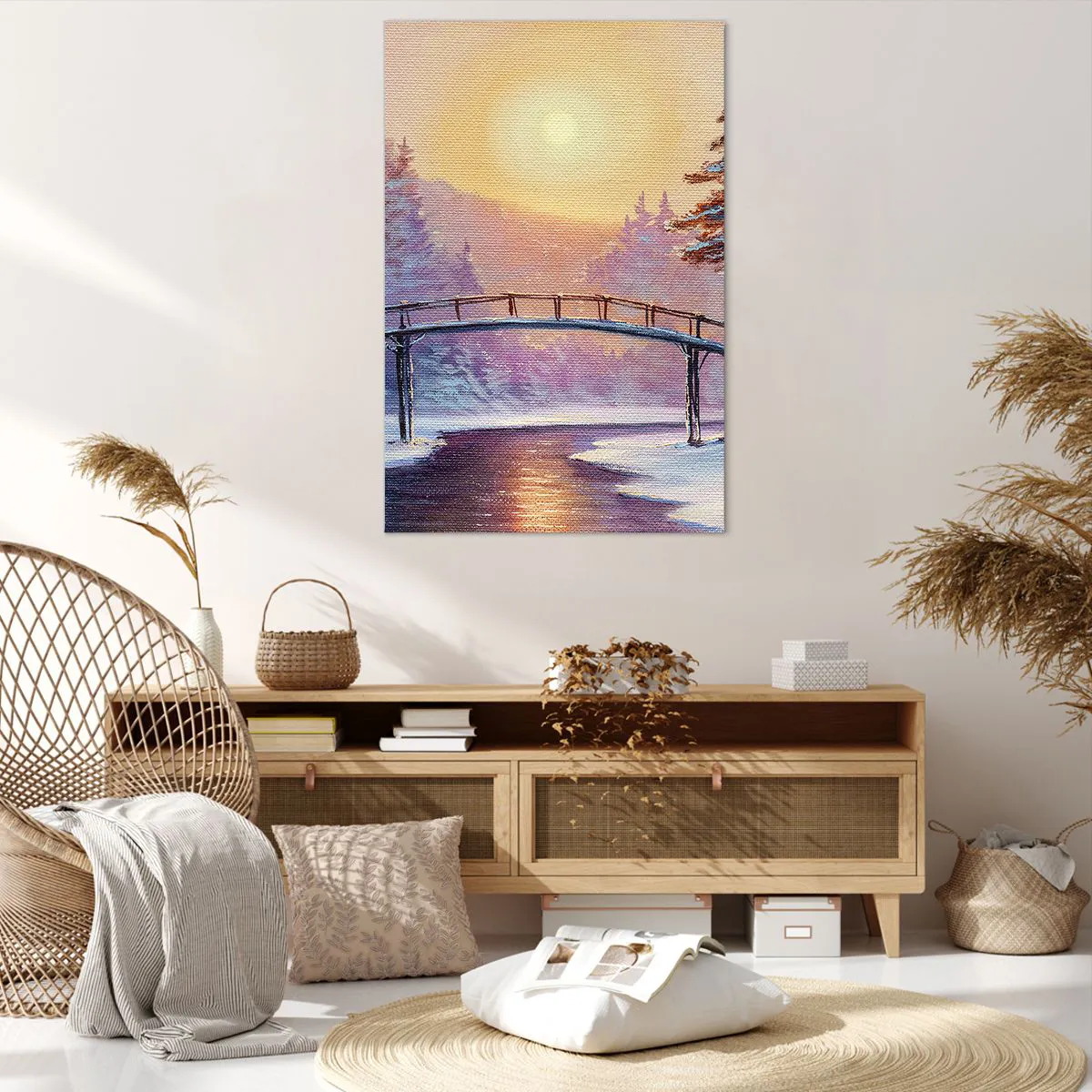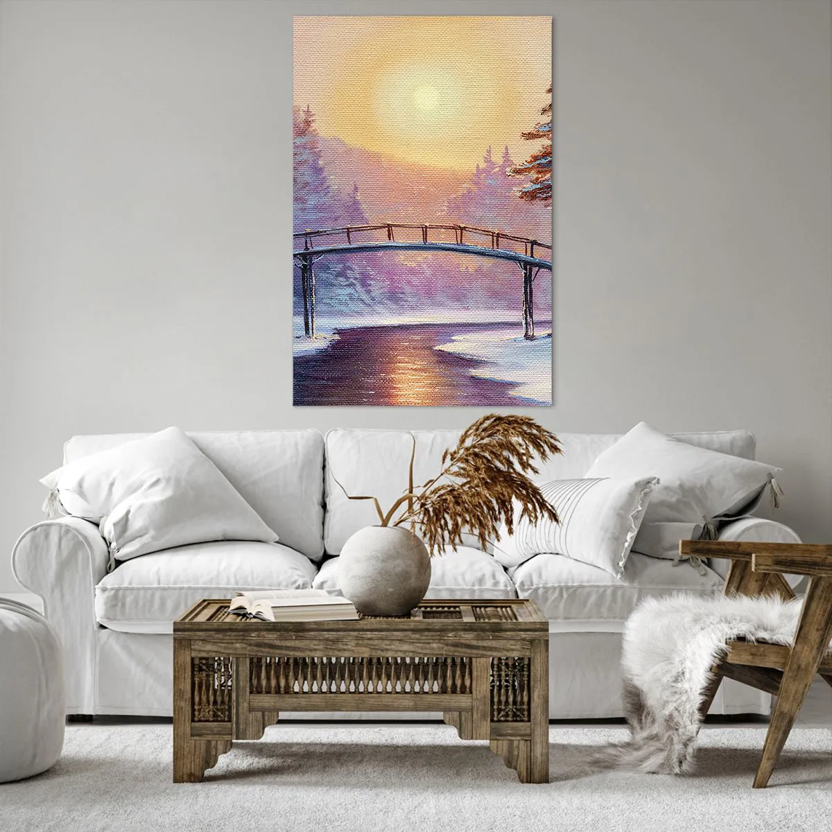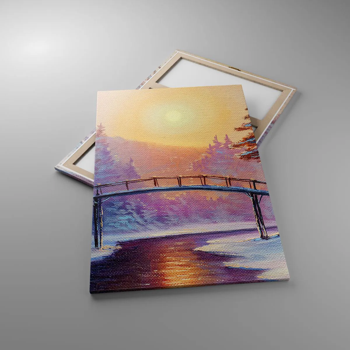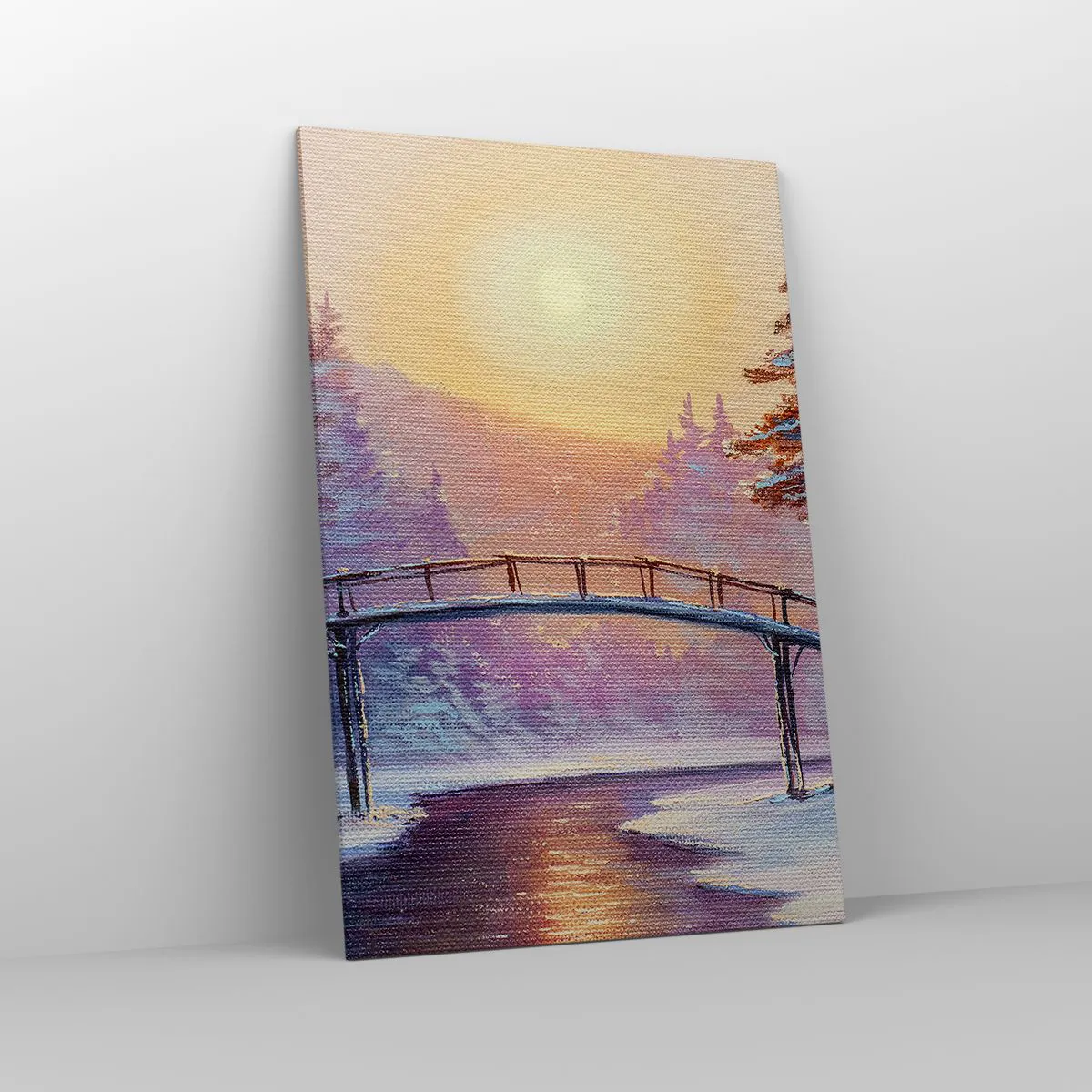Bild auf Leinwand - Leinwandbild - Winterlandschaft mit einer vom Sonnenuntergang beleuchteten Brücke - 80x120cm - Vier Jahreszeiten - Winter - Moderne Wanddekoration für Wohnzimmer und Schlafzimmer ARTTOR
