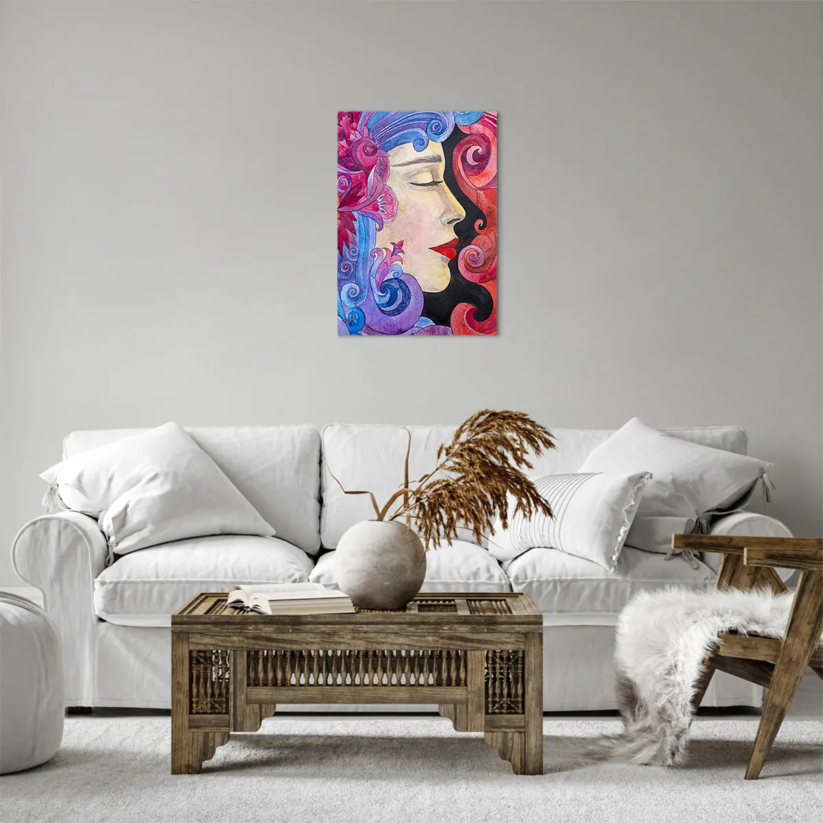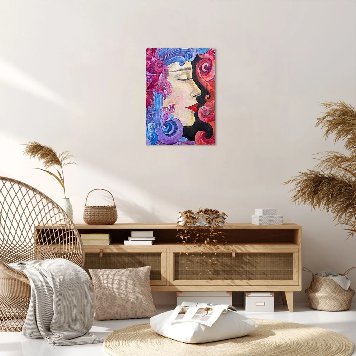 • Dieses Gemälde zeigt ein farbenfrohes, kunstvoll gestaltetes Frauenprofil voller lebendiger Farben und Details. Perfekt für Innenräume, die einen unverwechselbaren und inspirierenden dekorativen Akzent setzen sollen.