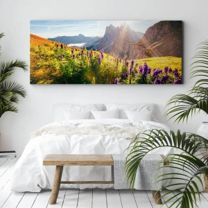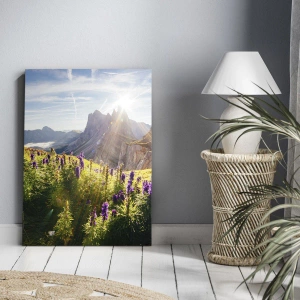 Bild auf Leinwand - Leinwandbild - Berglandschaft mit Blumen im Licht der aufgehenden Sonne - 70x100cm - Das geheime Leben der Kräuter - Moderne Wanddekoration für Wohnzimmer und Schlafzimmer ARTTOR