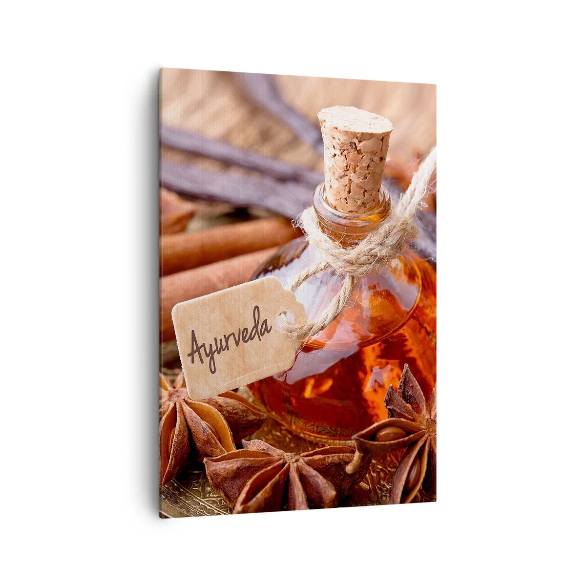 Bild auf Leinwand - Leinwandbild - Eine Flasche Gewürzöl auf einem Tablett - 70x100cm - Zur Einheit von Körper und Geist - Moderne Wanddekoration für Wohnzimmer und Schlafzimmer ARTTOR
