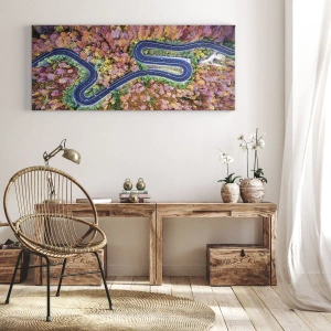 • Ein Gemälde, das eine kurvenreiche Straße durch einen herbstlichen Wald aus der Vogelperspektive darstellt. Dieses Dekor fängt die Schönheit der Natur und die Harmonie des Raumes ein.
