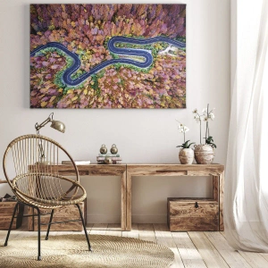 Die Leinwand wird über den Rahmen gespannt. Die Seiten und Kanten werden gedruckt, um das Bild fortzusetzen. Das Bild ist fertig zum Aufhängen an der Wand. Jedes Produkt hat einen am Rahmen befestigten Anhänger und ein Montageset (Schraube + Stift).