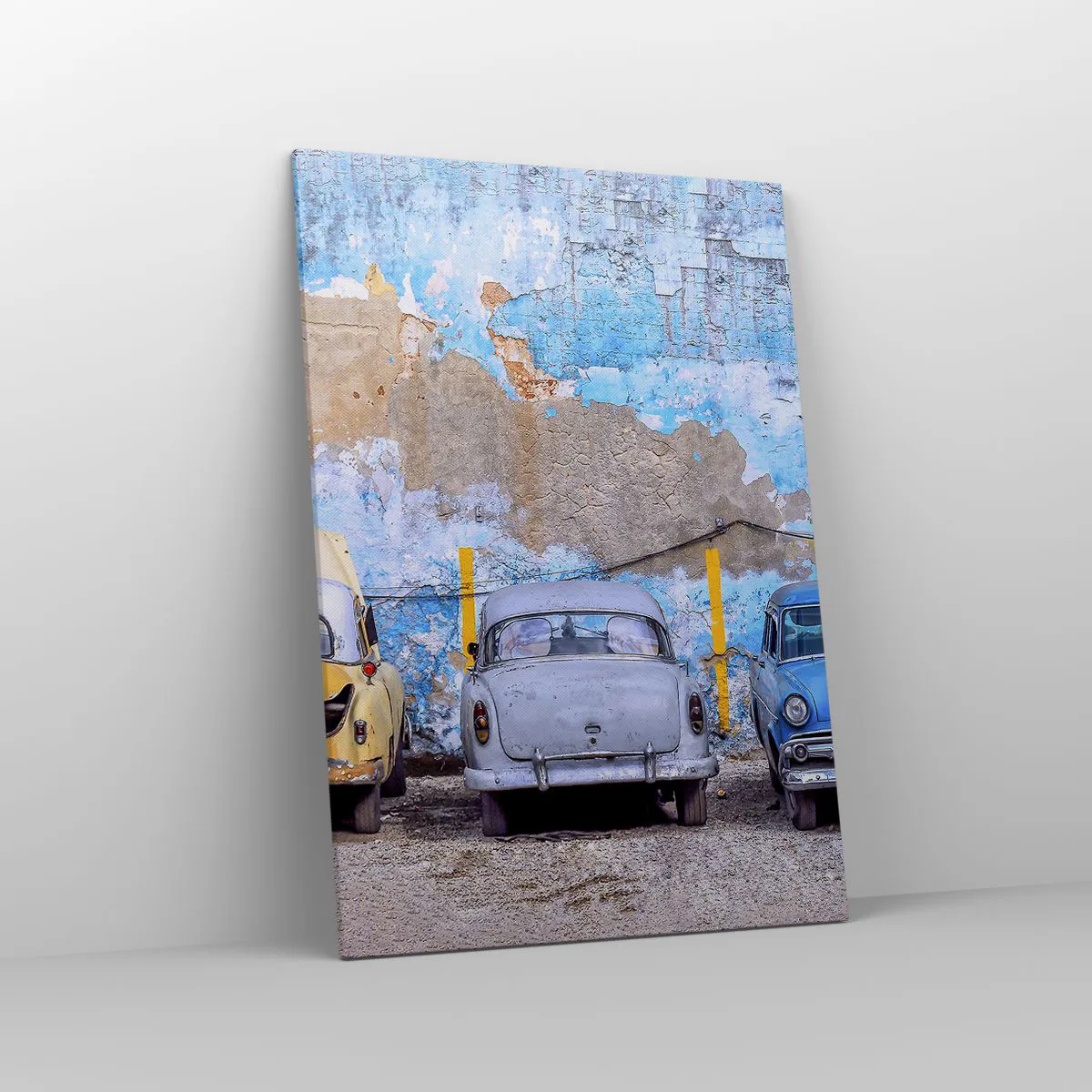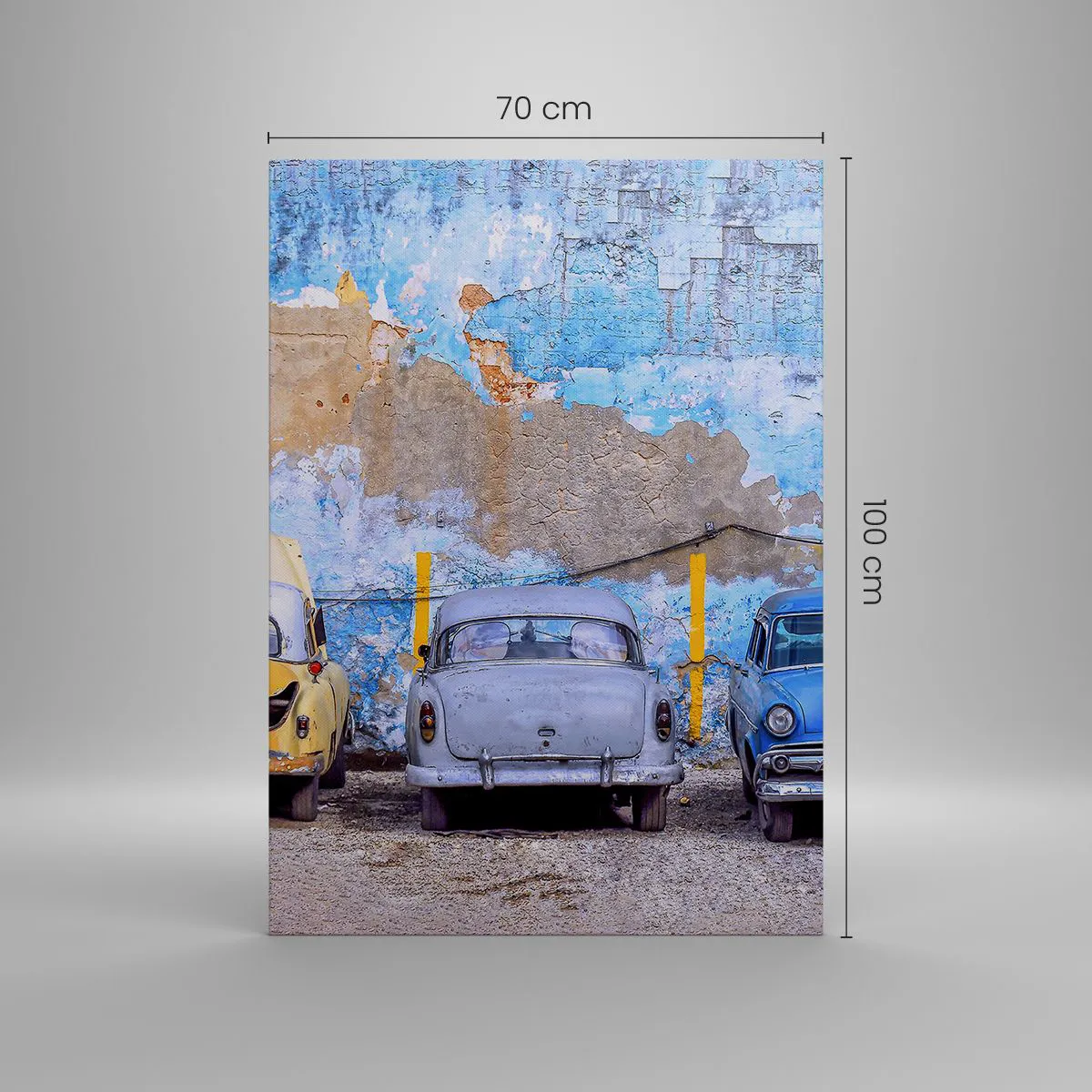 Bild auf Leinwand - Leinwandbild - Alte Autos vor dem Hintergrund einer zerstörten Mauer - 70x100cm - Treffen der Veteranen - Moderne Wanddekoration für Wohnzimmer und Schlafzimmer ARTTOR