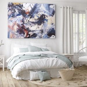 Die Leinwand wird über den Rahmen gespannt. Die Seiten und Kanten werden gedruckt, um das Bild fortzusetzen. Das Bild ist fertig zum Aufhängen an der Wand. Jedes Produkt hat einen am Rahmen befestigten Anhänger und ein Montageset (Schraube + Stift).