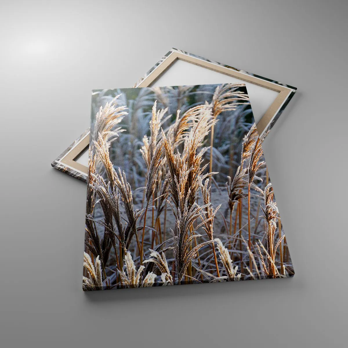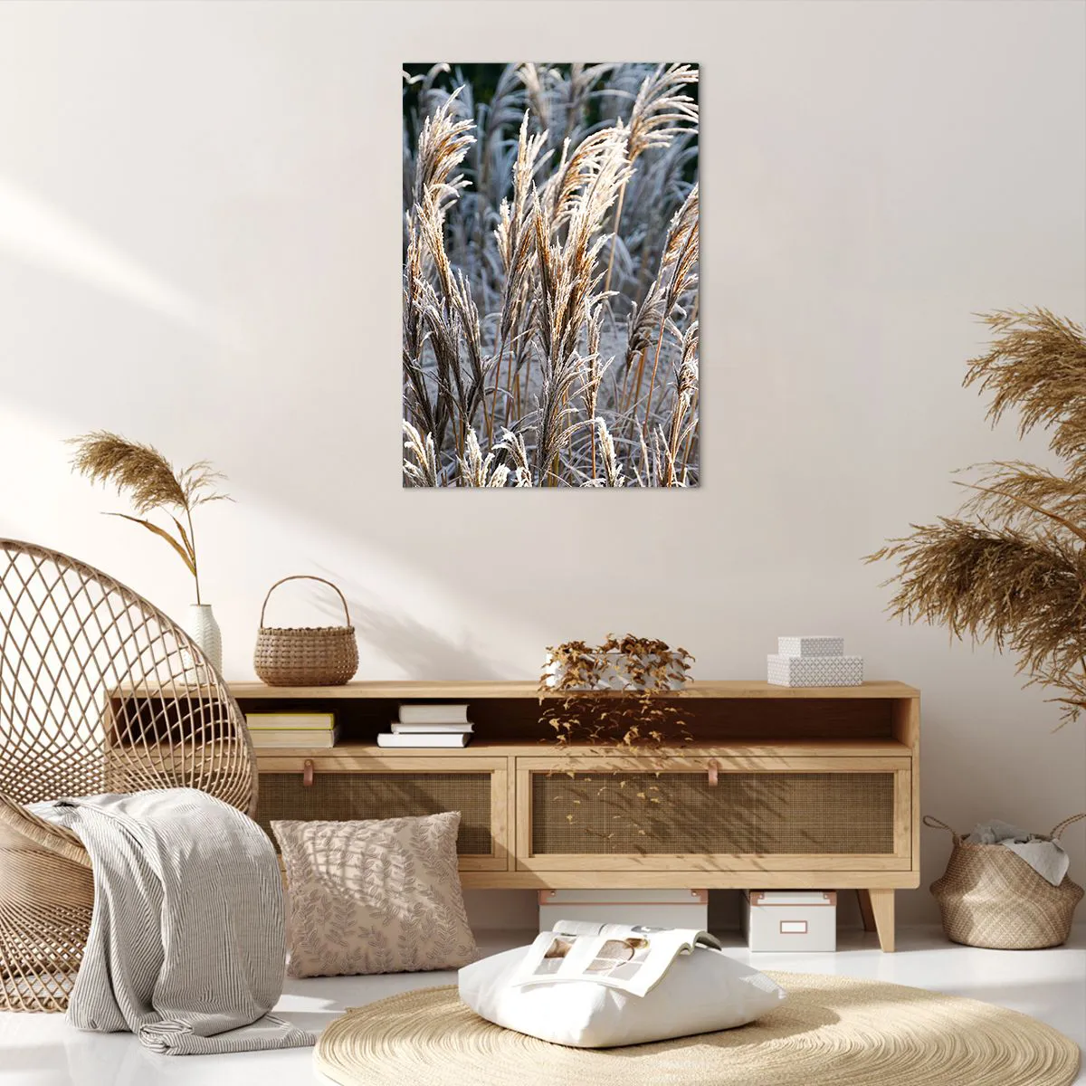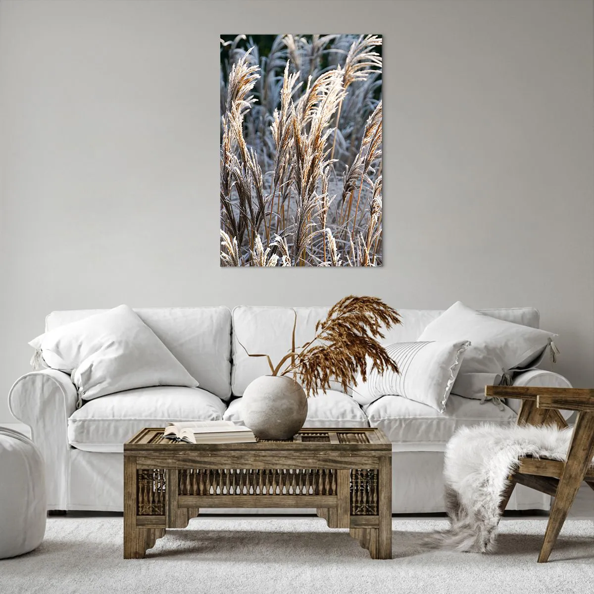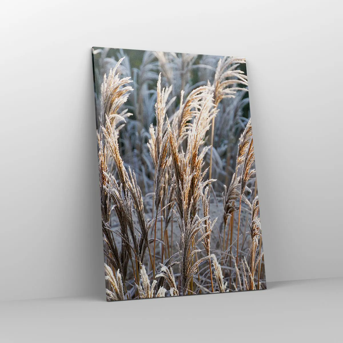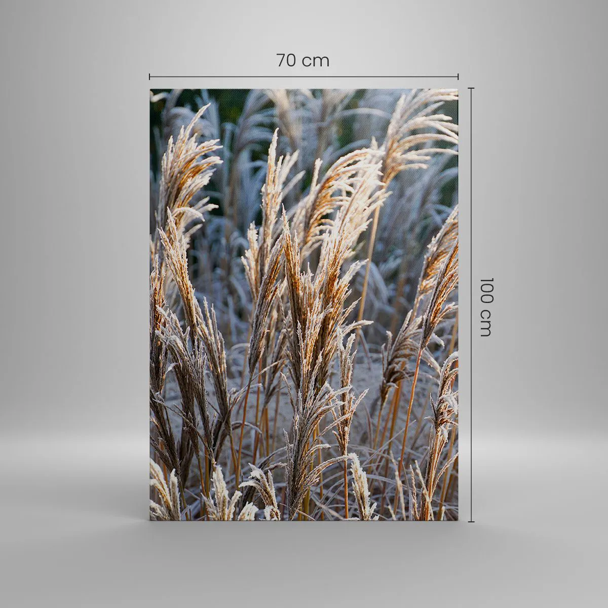 Bild auf Leinwand - Leinwandbild - Winterliche Grashalme mit Frost bedeckt vor einem dunkelgrünen Hintergrund - 70x100cm - Gekleidet mit Frost - Moderne Wanddekoration für Wohnzimmer und Schlafzimmer ARTTOR