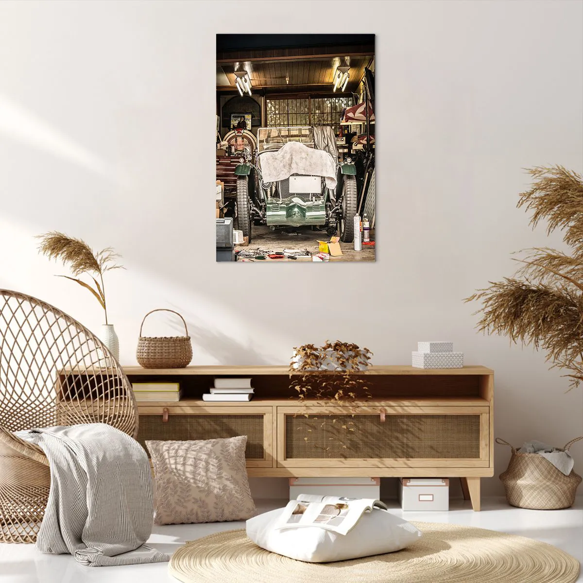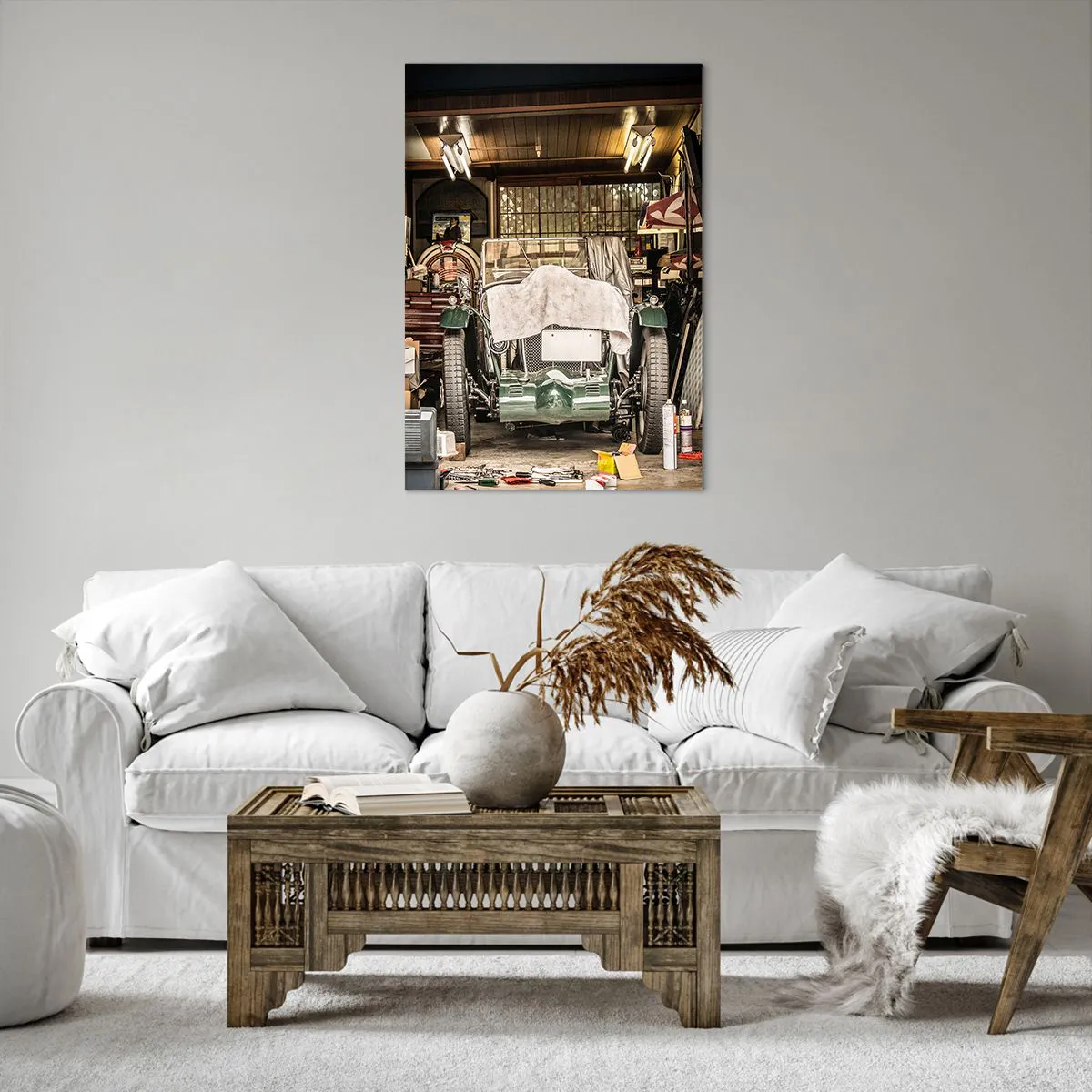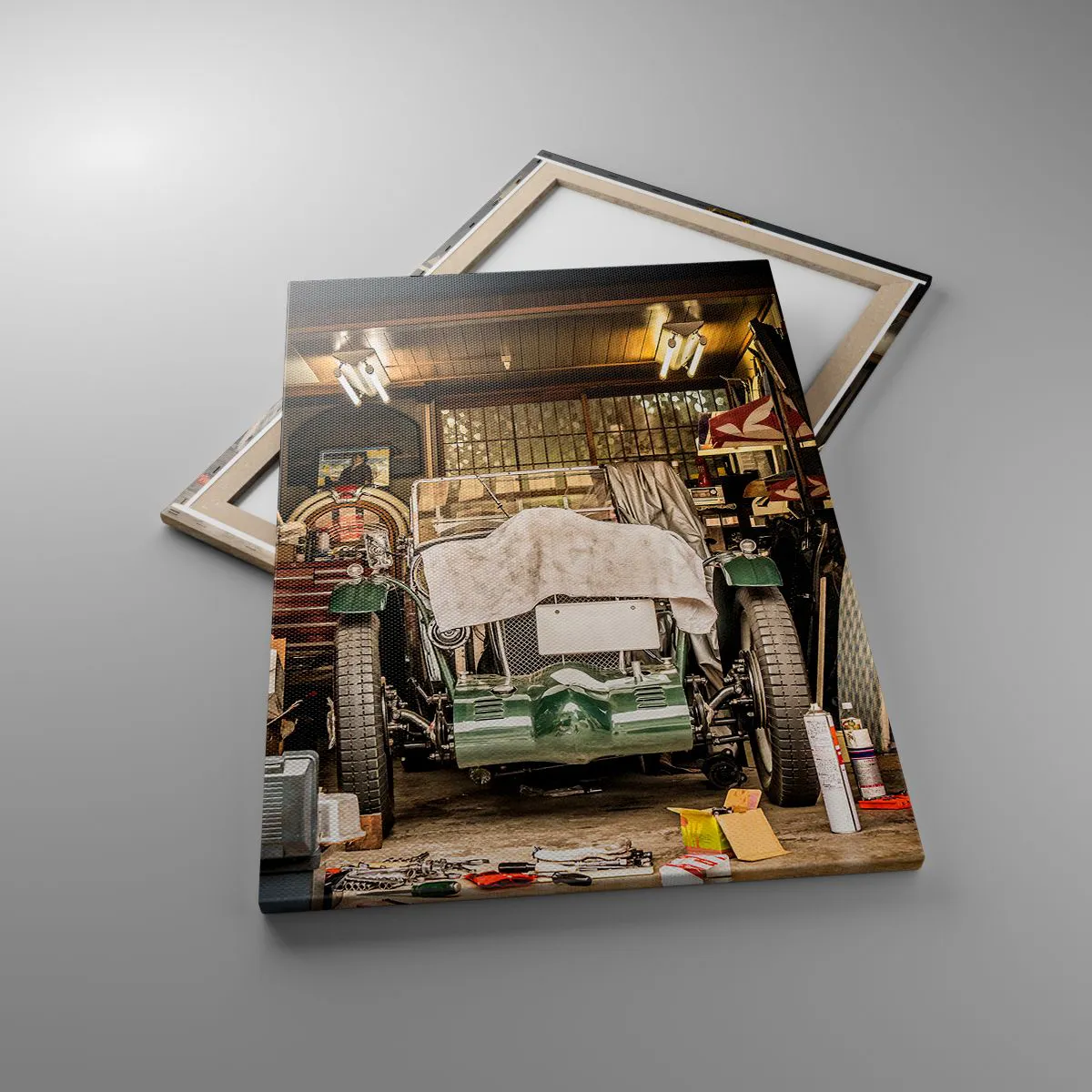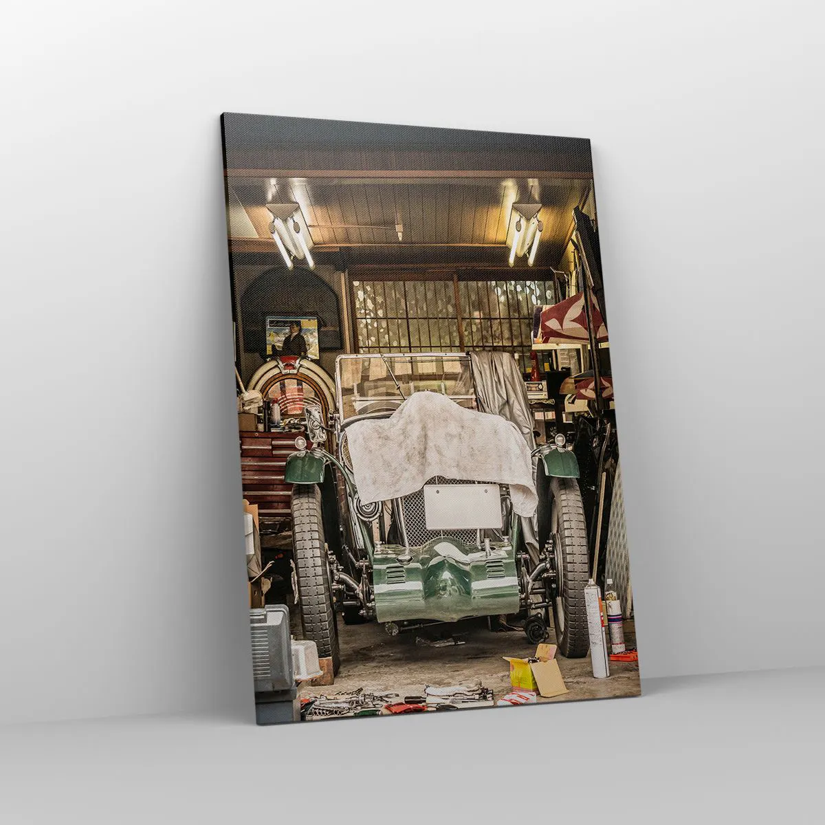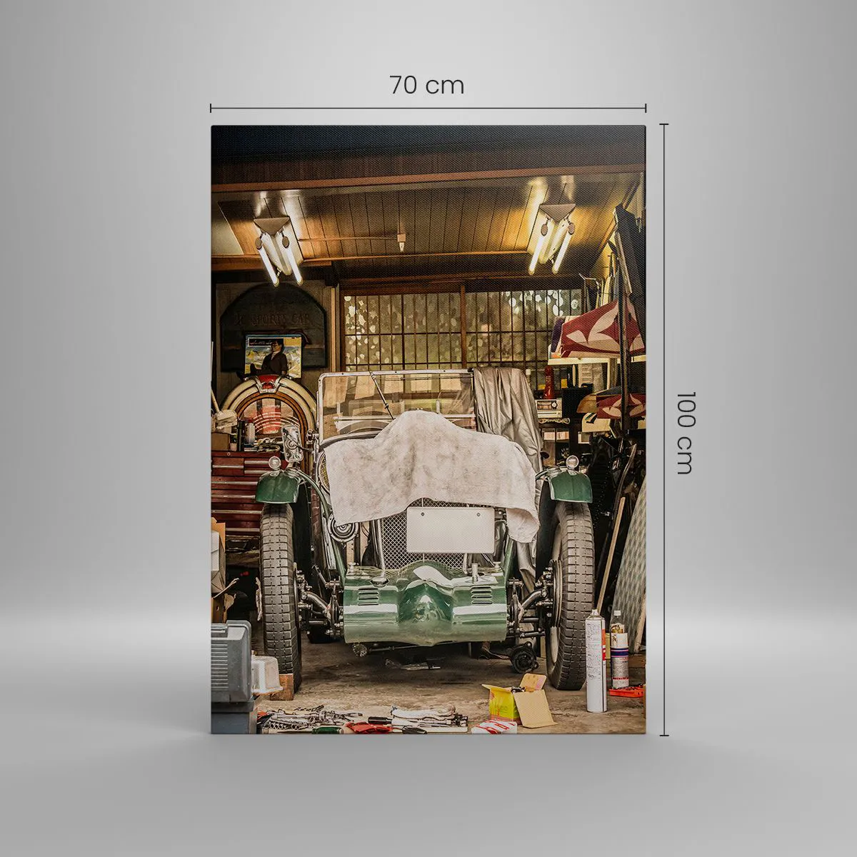 Bild auf Leinwand - Leinwandbild - Ein altes Auto in einer Garage, umgeben von Werkzeugen und Geräten - 70x100cm - Zurück in die Vergangenheit - Moderne Wanddekoration für Wohnzimmer und Schlafzimmer ARTTOR