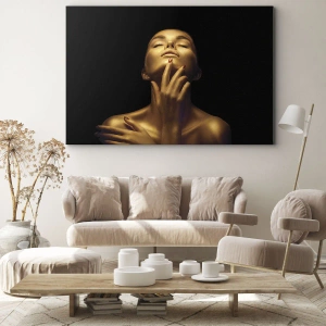 Bild auf Leinwand - Leinwandbild - Porträt einer Frau in goldenem Glanz auf schwarzem Hintergrund - 80x120cm - Wie goldene Seide - Moderne Wanddekoration für Wohnzimmer und Schlafzimmer ARTTOR