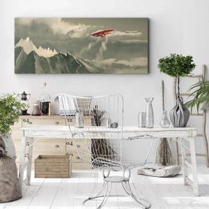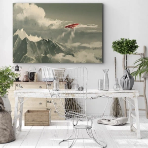 Bild auf Leinwand - Leinwandbild - Rotes Flugzeug über schneebedeckten Bergen - 70x100cm - Furchtloser Pionier - Moderne Wanddekoration für Wohnzimmer und Schlafzimmer ARTTOR