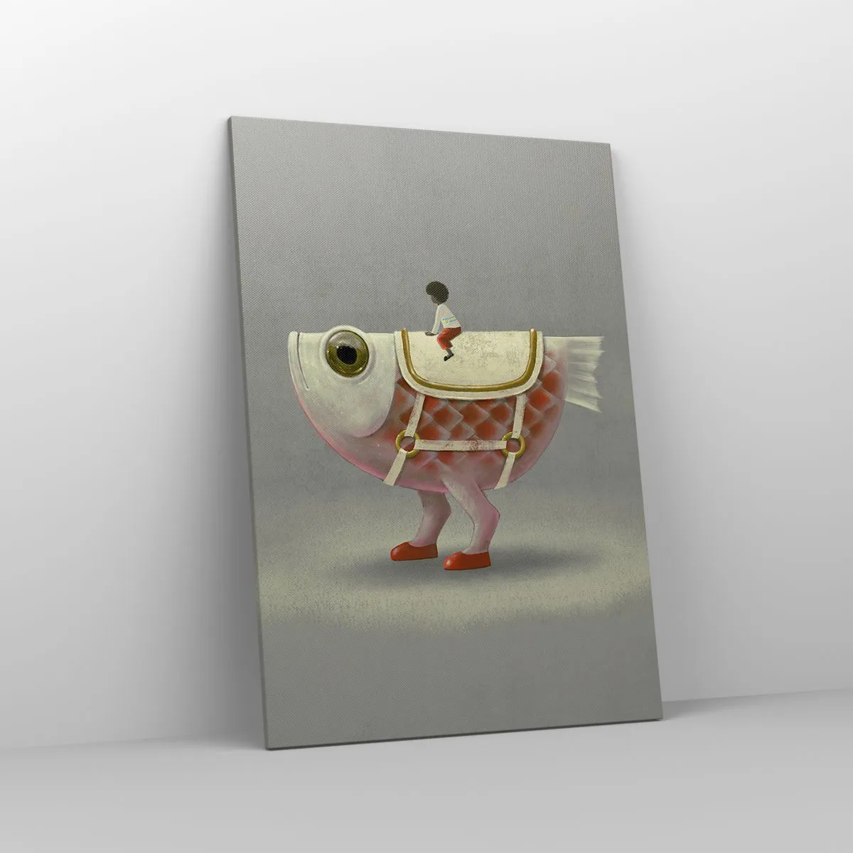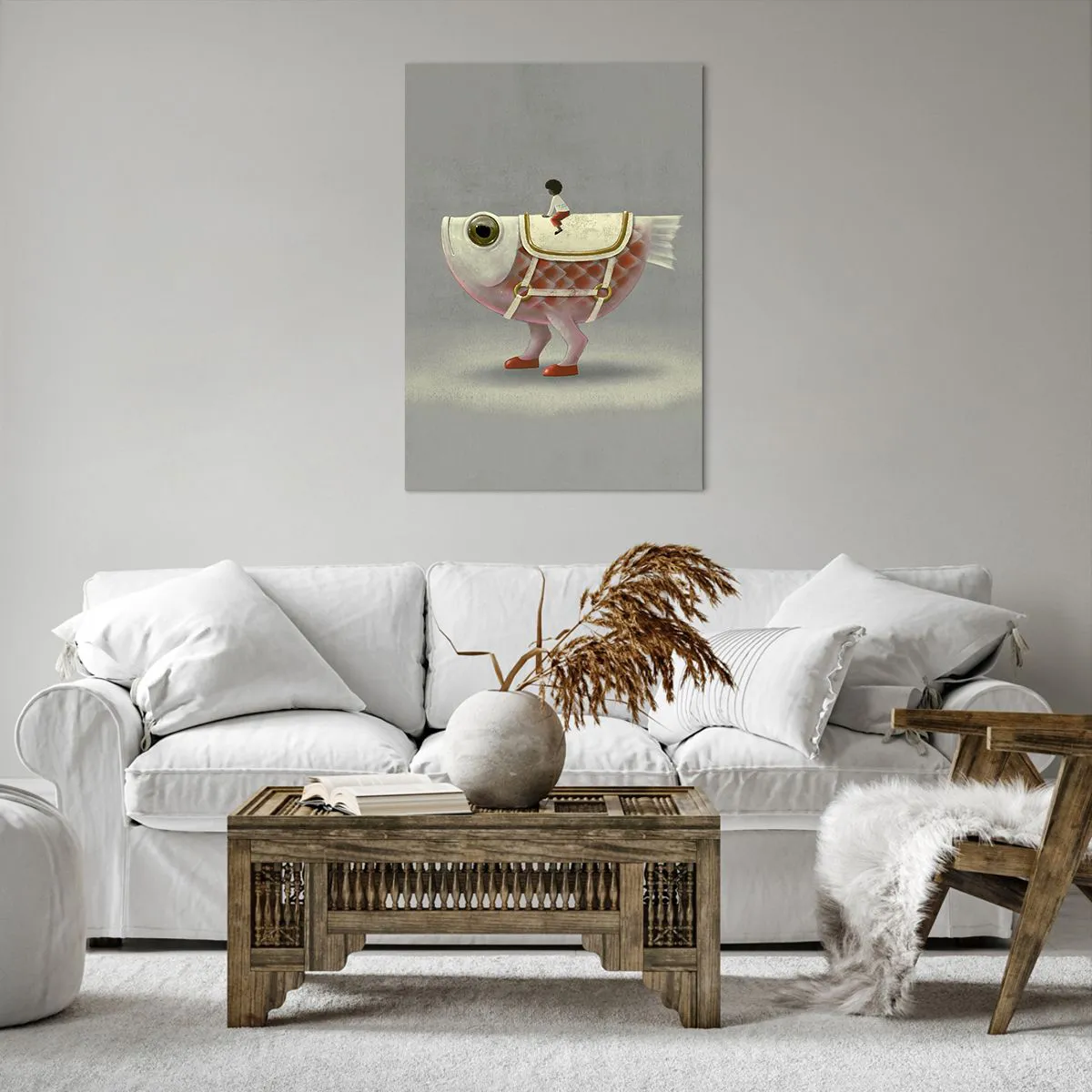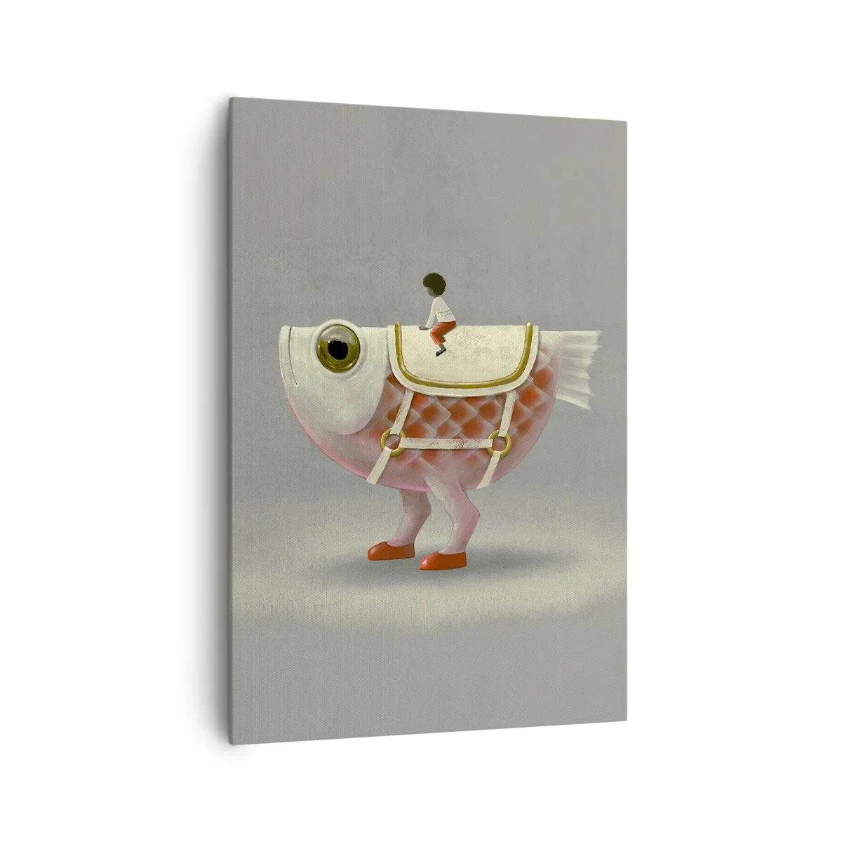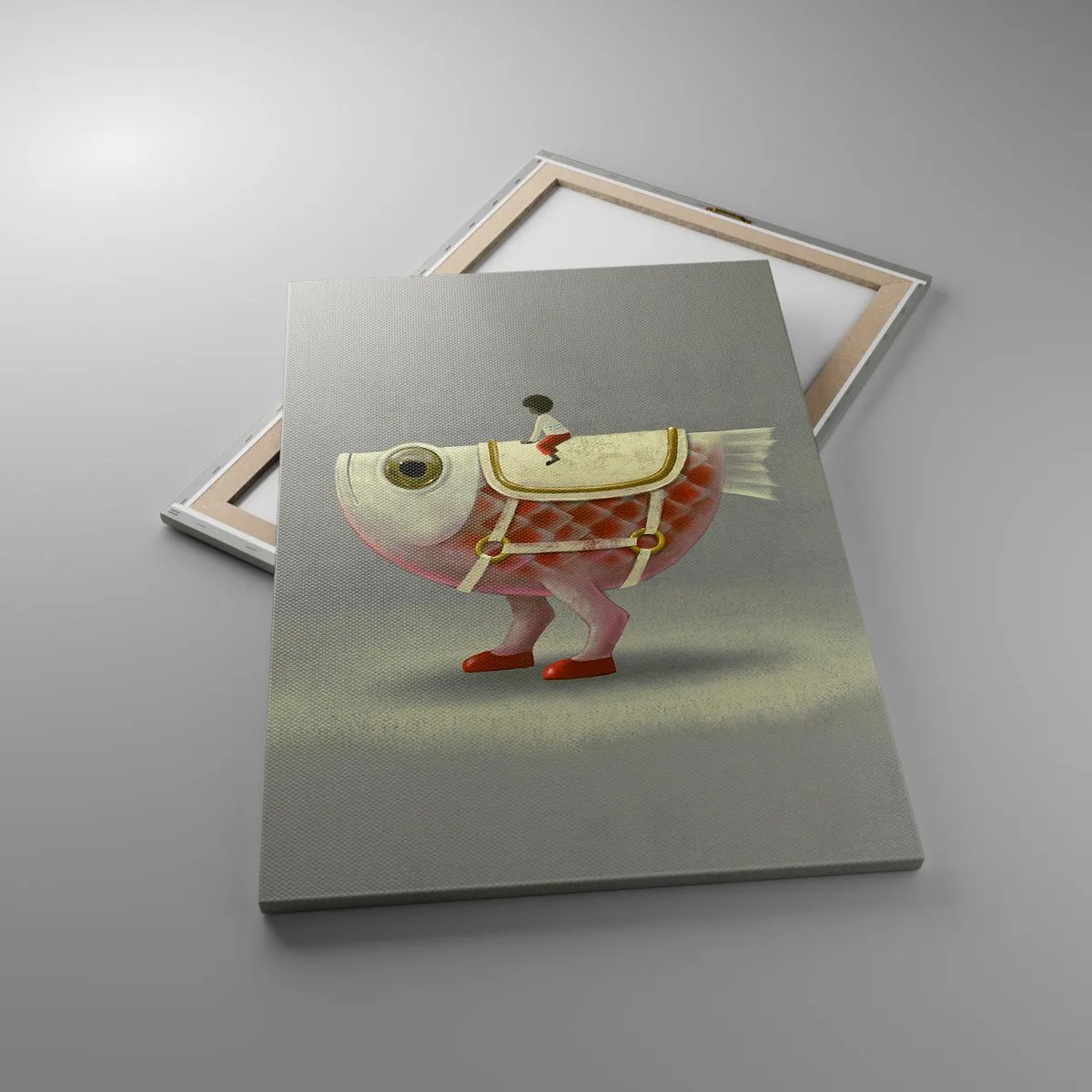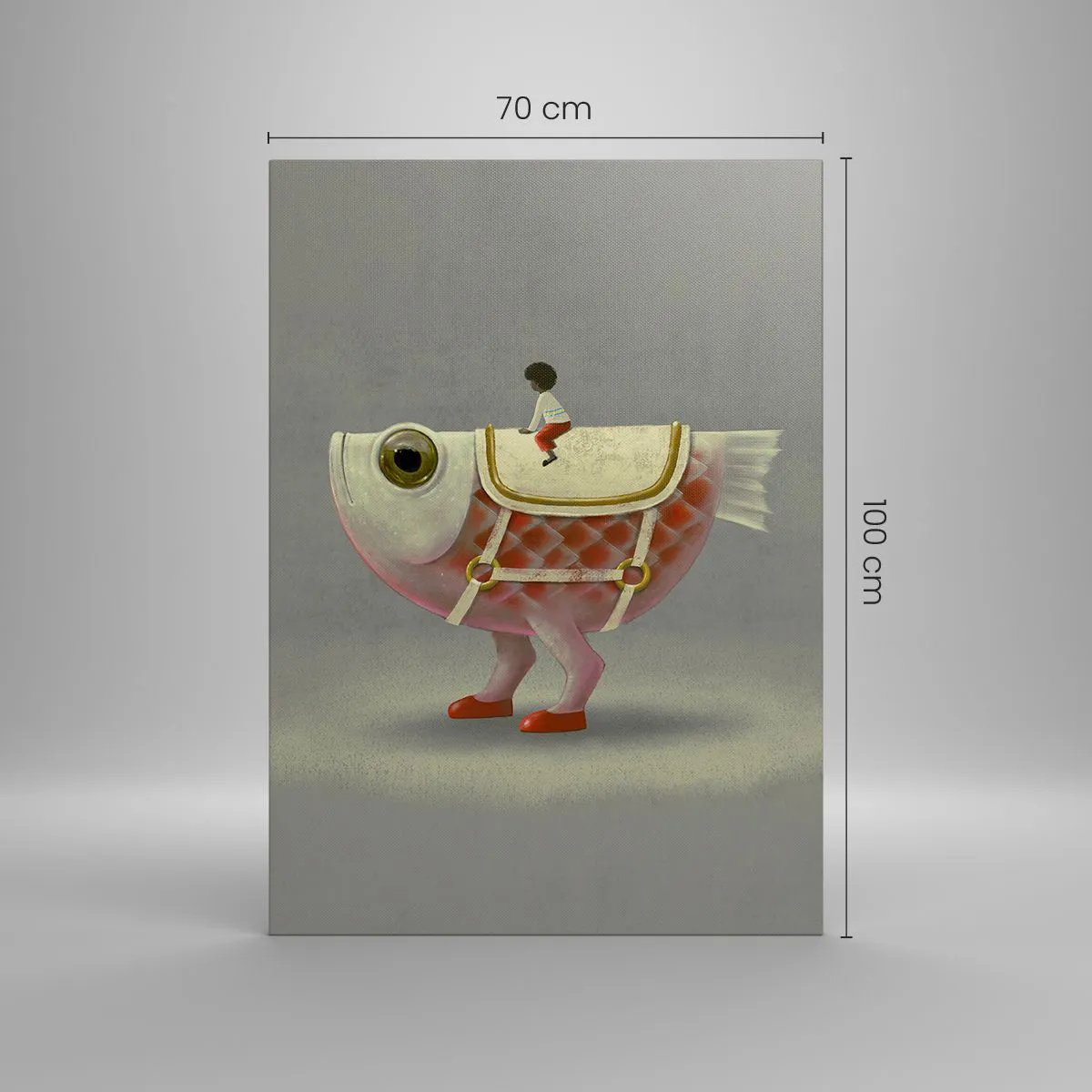 Bild auf Leinwand - Leinwandbild - Ein schicker Fischreiter mit Beinen und Sattel - 70x100cm - Reiter auf einem surrealen Fisch - Moderne Wanddekoration für Wohnzimmer und Schlafzimmer ARTTOR