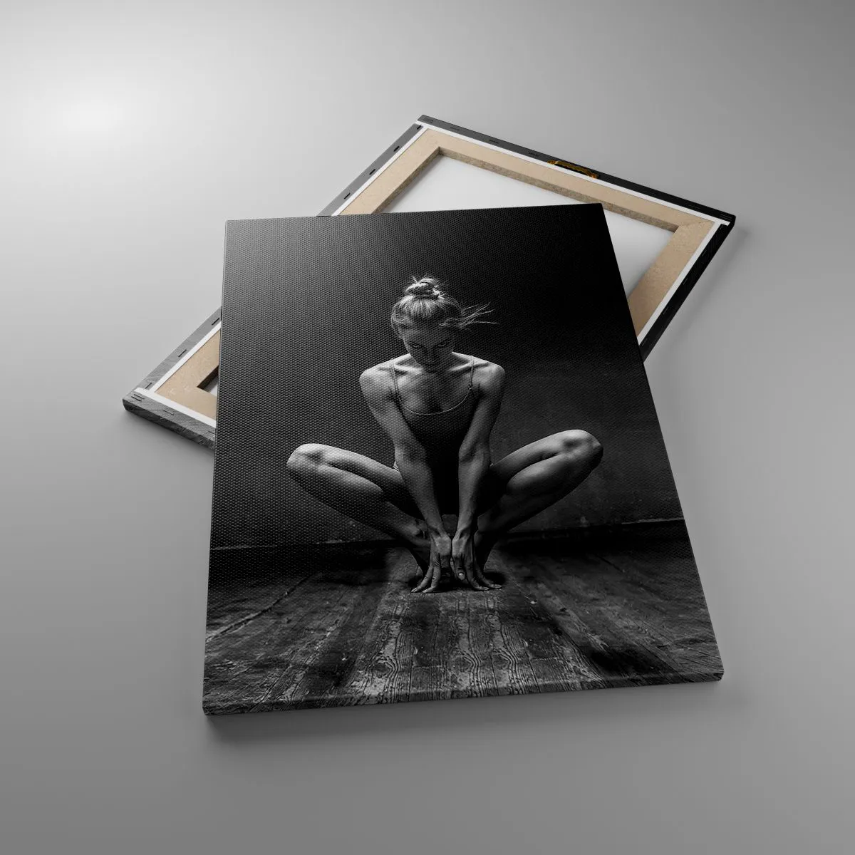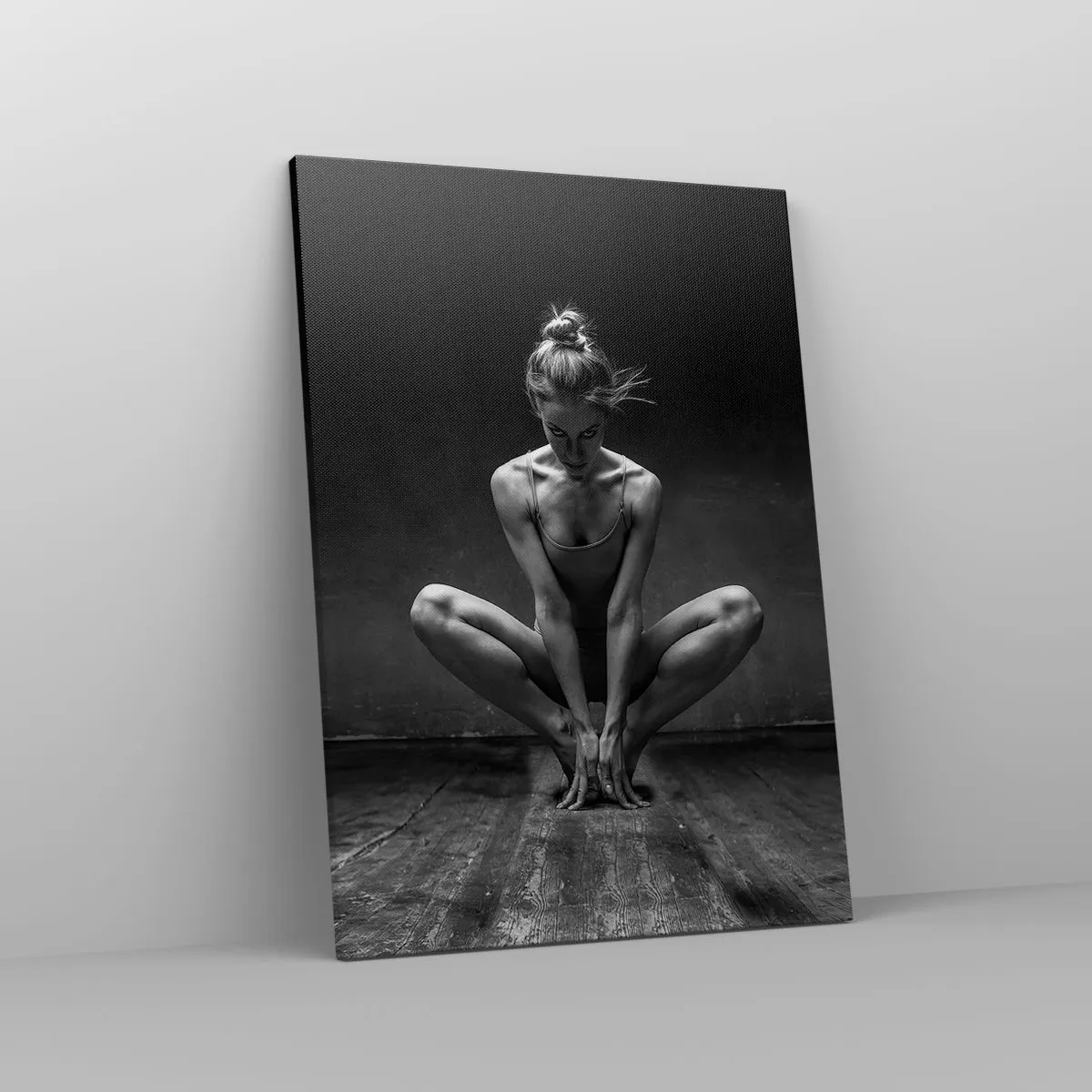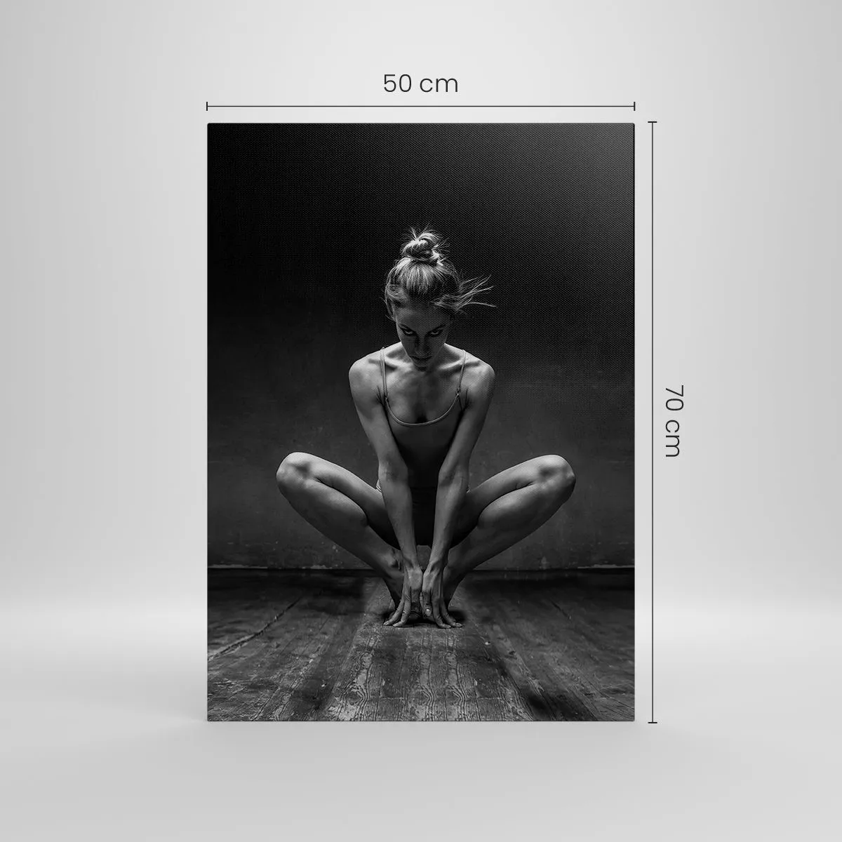 Bild auf Leinwand - Leinwandbild - Ein Schwarz-Weiß-Porträt einer Tänzerin in voller Konzentration. - 50x70cm - Konzentration der Tanzenergie - Moderne Wanddekoration für Wohnzimmer und Schlafzimmer ARTTOR