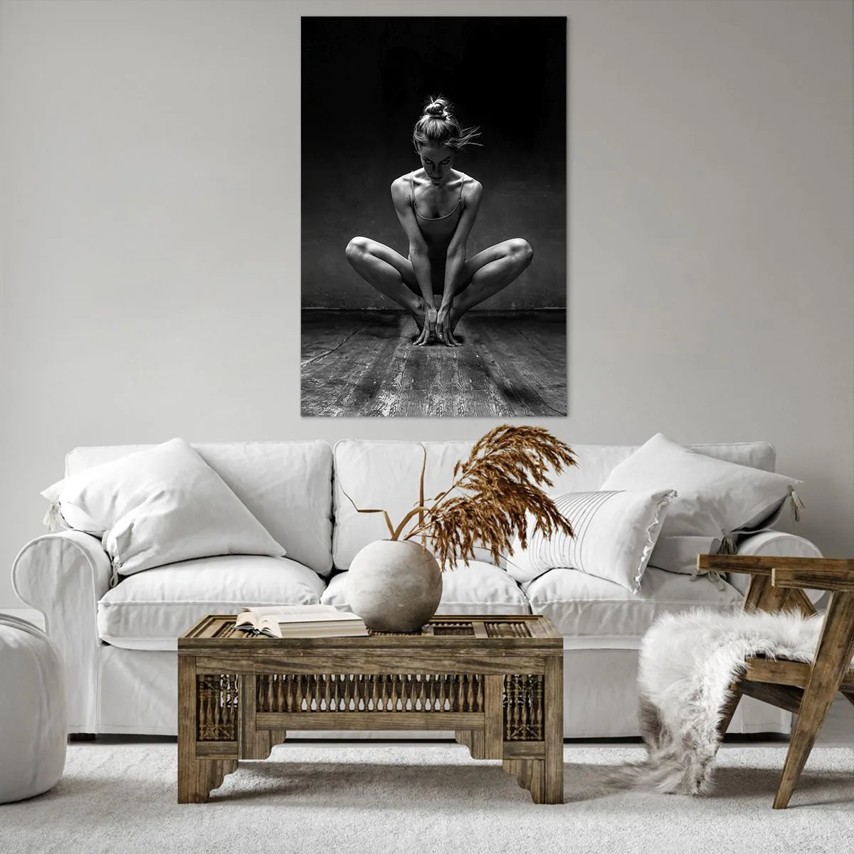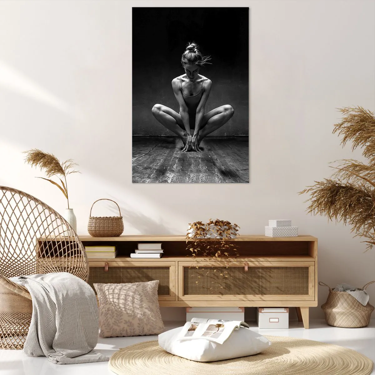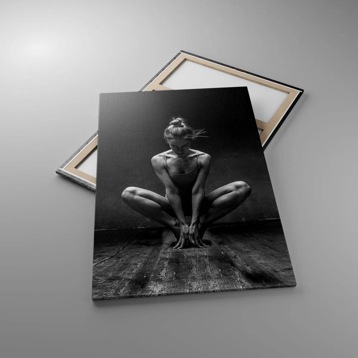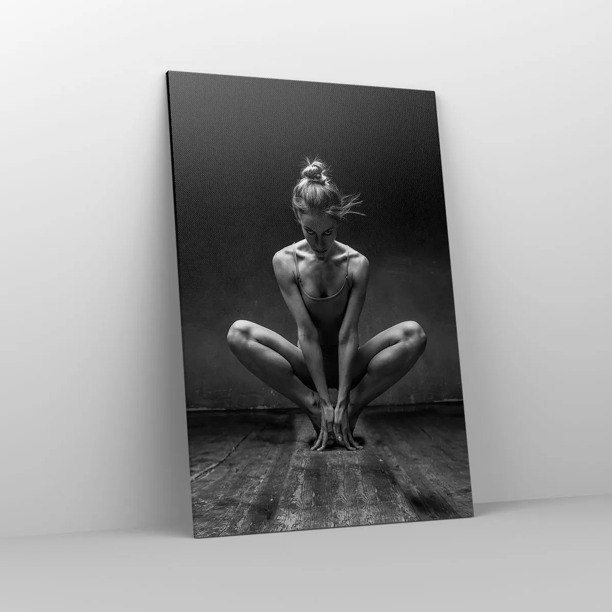 Bild auf Leinwand - Leinwandbild - Ein Schwarz-Weiß-Porträt einer Tänzerin in voller Konzentration. - 80x120cm - Konzentration der Tanzenergie - Moderne Wanddekoration für Wohnzimmer und Schlafzimmer ARTTOR