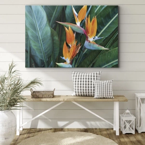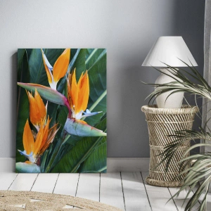 Bild auf Leinwand - Leinwandbild - Exotische Strelitzienblüten, umgeben von grünen Blättern - 50x70cm - Ist es eine Blume oder ist es ein Vogel? - Moderne Wanddekoration für Wohnzimmer und Schlafzimmer ARTTOR
