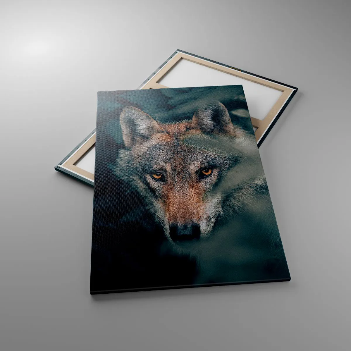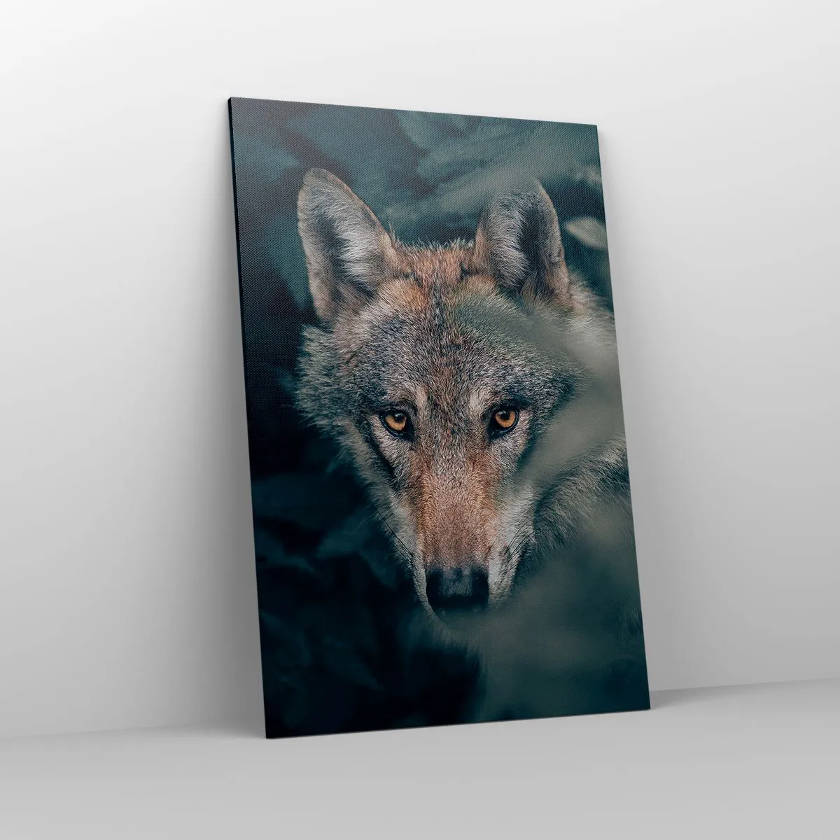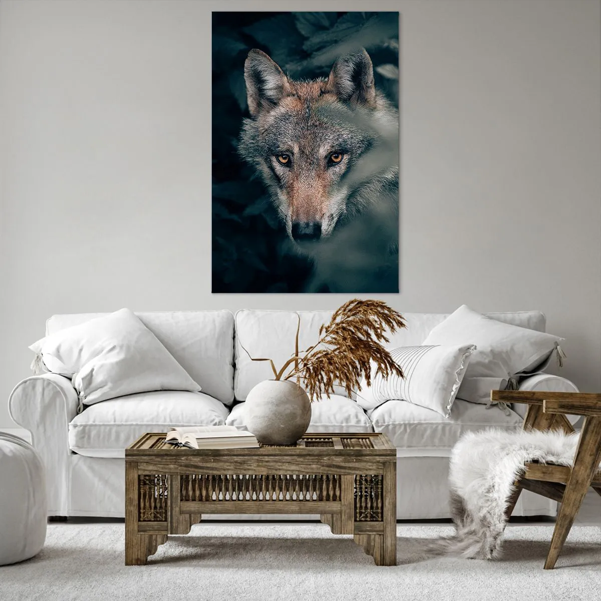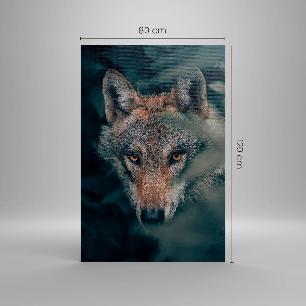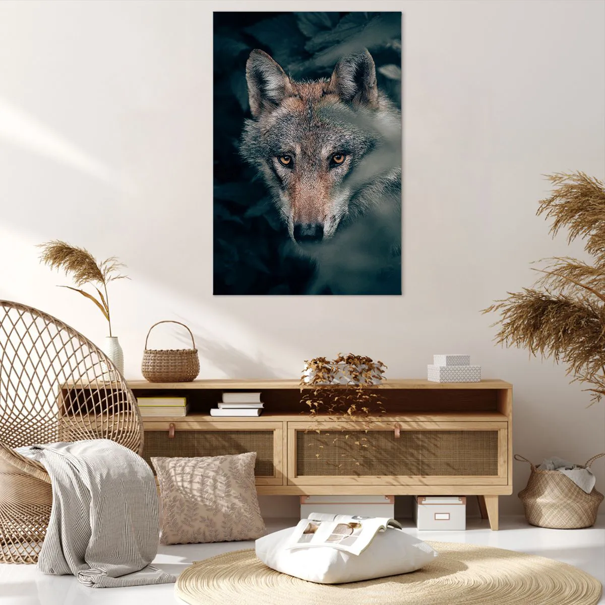 Bild auf Leinwand - Leinwandbild - Ein Wolf in seiner natürlichen Umgebung, der aus den Tiefen des Waldes hervorschaut. - 80x120cm - Jäger - Moderne Wanddekoration für Wohnzimmer und Schlafzimmer ARTTOR