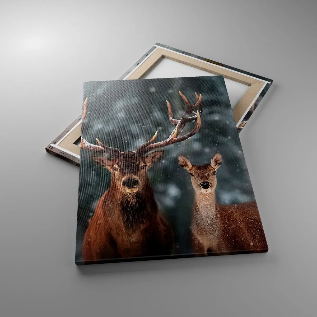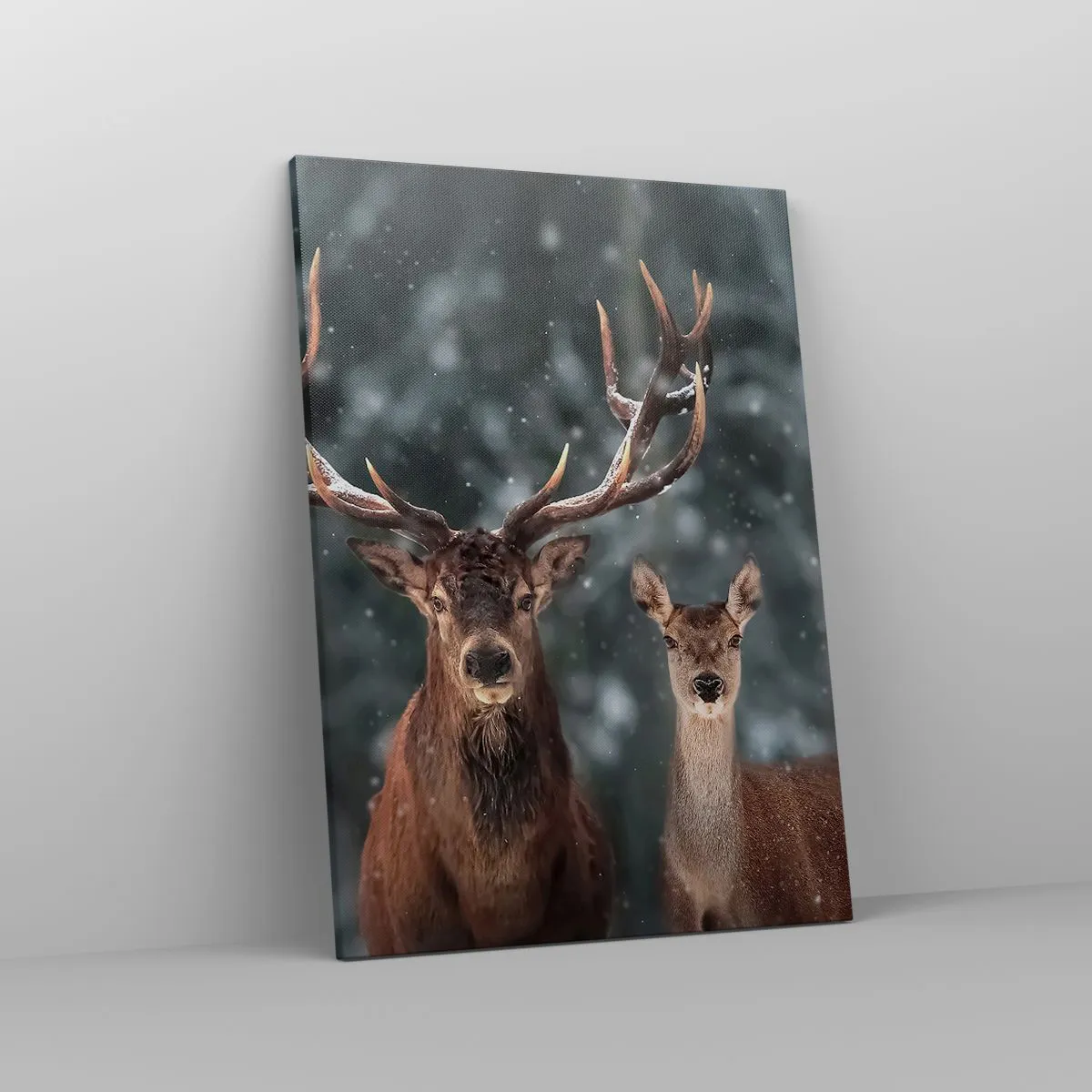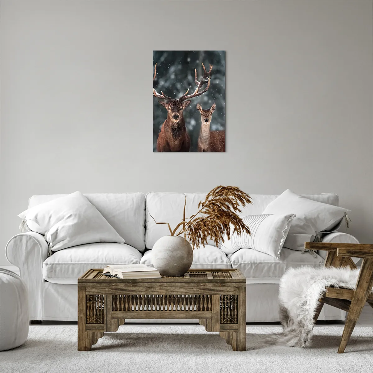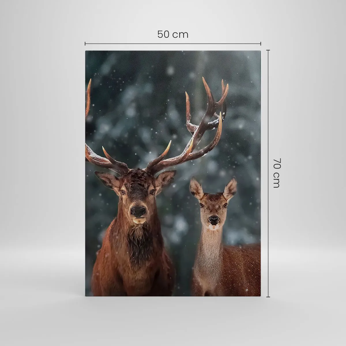 Bild auf Leinwand - Leinwandbild - Hirsche im verschneiten Winterwald - 50x70cm - Herr des Waldes mit seiner Frau - Moderne Wanddekoration für Wohnzimmer und Schlafzimmer ARTTOR