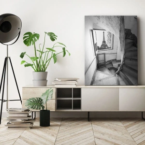 Die Seiten und Kanten werden gedruckt, um das Bild fortzusetzen. Die Leinwand wird über den Rahmen gespannt. Das Bild ist fertig zum Aufhängen an der Wand. Jedes Produkt hat einen am Rahmen befestigten Anhänger und ein Montageset (Schraube + Stift).