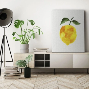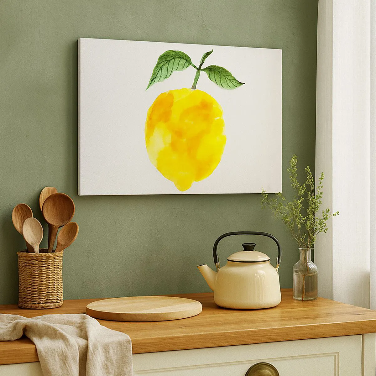 Das Gemälde „How to Taste the Sun“ zeigt eine Zitrone im Aquarellstil, die durch ihre Schlichtheit und Subtilität besticht. Die grünen Blätter und die intensive gelbe Farbe der Frucht kontrastieren mit dem hellen Hintergrund und schaffen so eine harmonische und ästhetische Komposition. Dieses Leinwandbild ist eine ausgezeichnete Wahl für Liebhaber naturinspirierter Kunst und bringt Leichtigkeit und Freude ins Interieur.