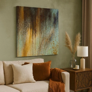 Bild auf Leinwand - Leinwandbild - Eine abstrakte Farbkomposition in Gold-, Braun- und Blautönen. - 120x50cm - Eine nicht zufällige farbenfrohe Komposition - Moderne Wanddekoration für Wohnzimmer und Schlafzimmer ARTTOR