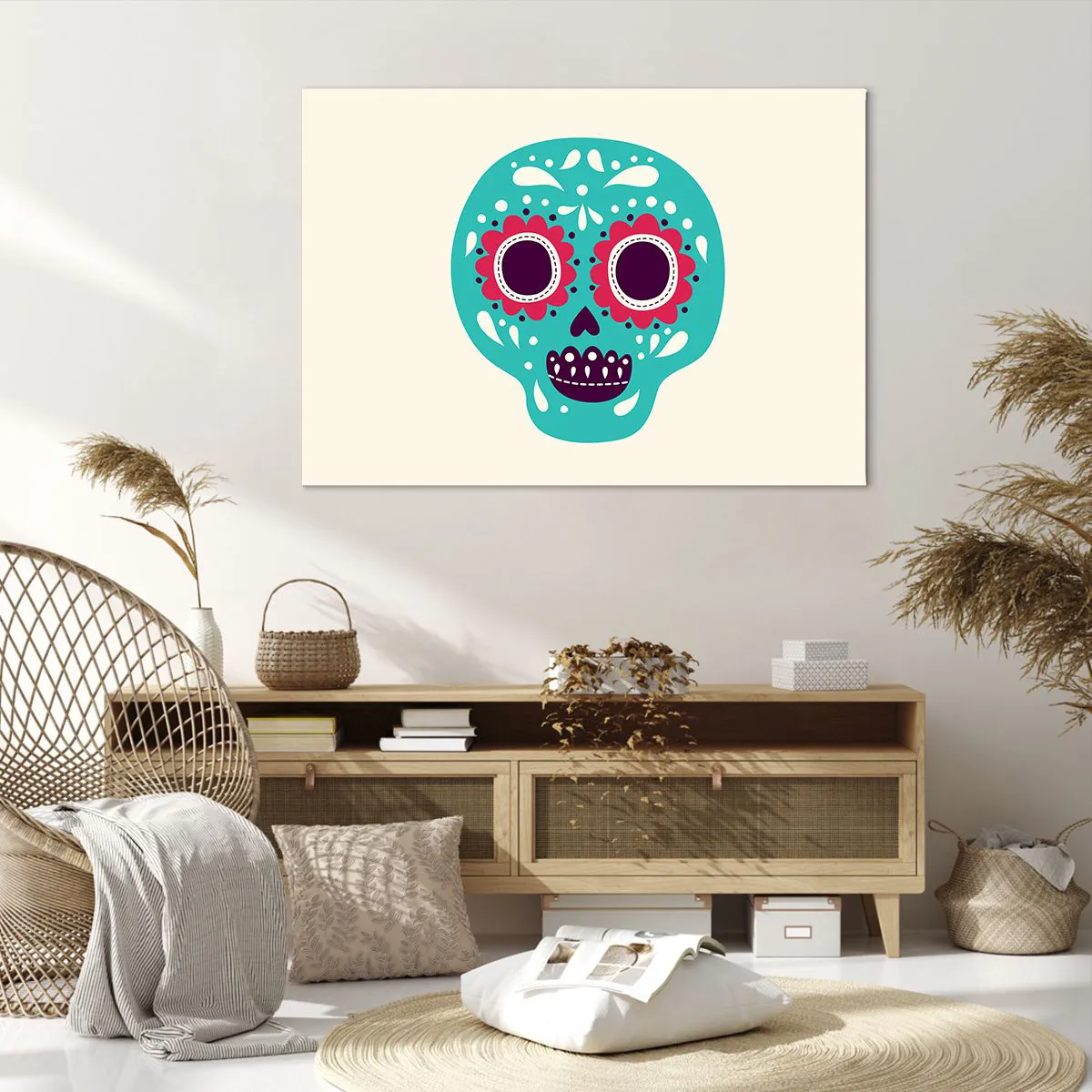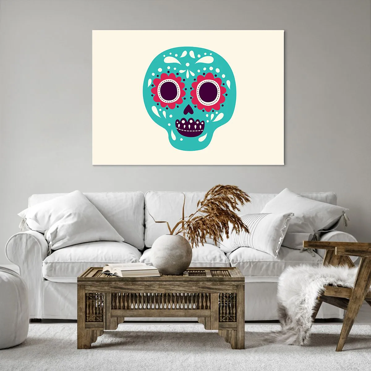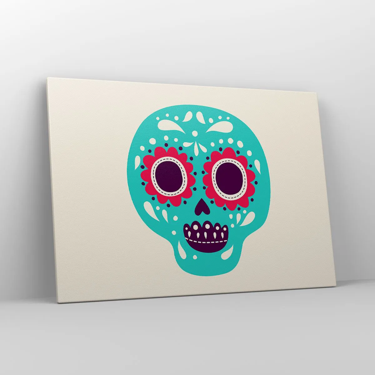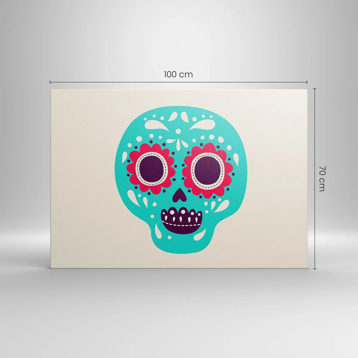 Bild auf Leinwand - Leinwandbild - Ein türkis-violetter Zuckerschädel, inspiriert von der mexikanischen Kultur - 100x70cm - Das Leben – Spaß bis zum Tod - Moderne Wanddekoration für Wohnzimmer und Schlafzimmer ARTTOR
