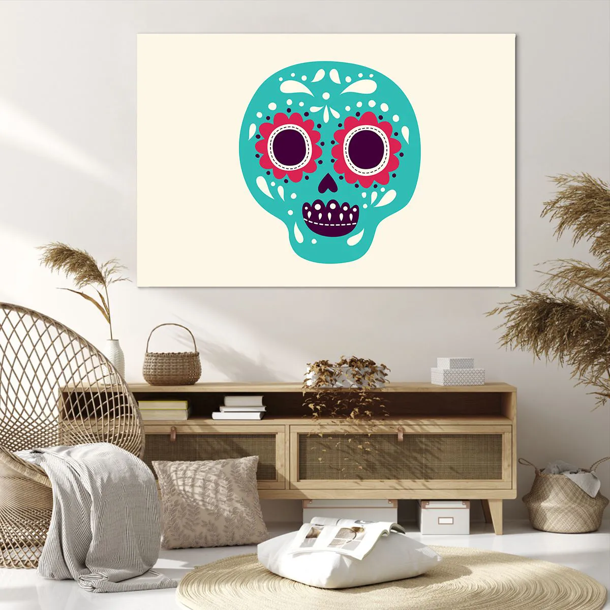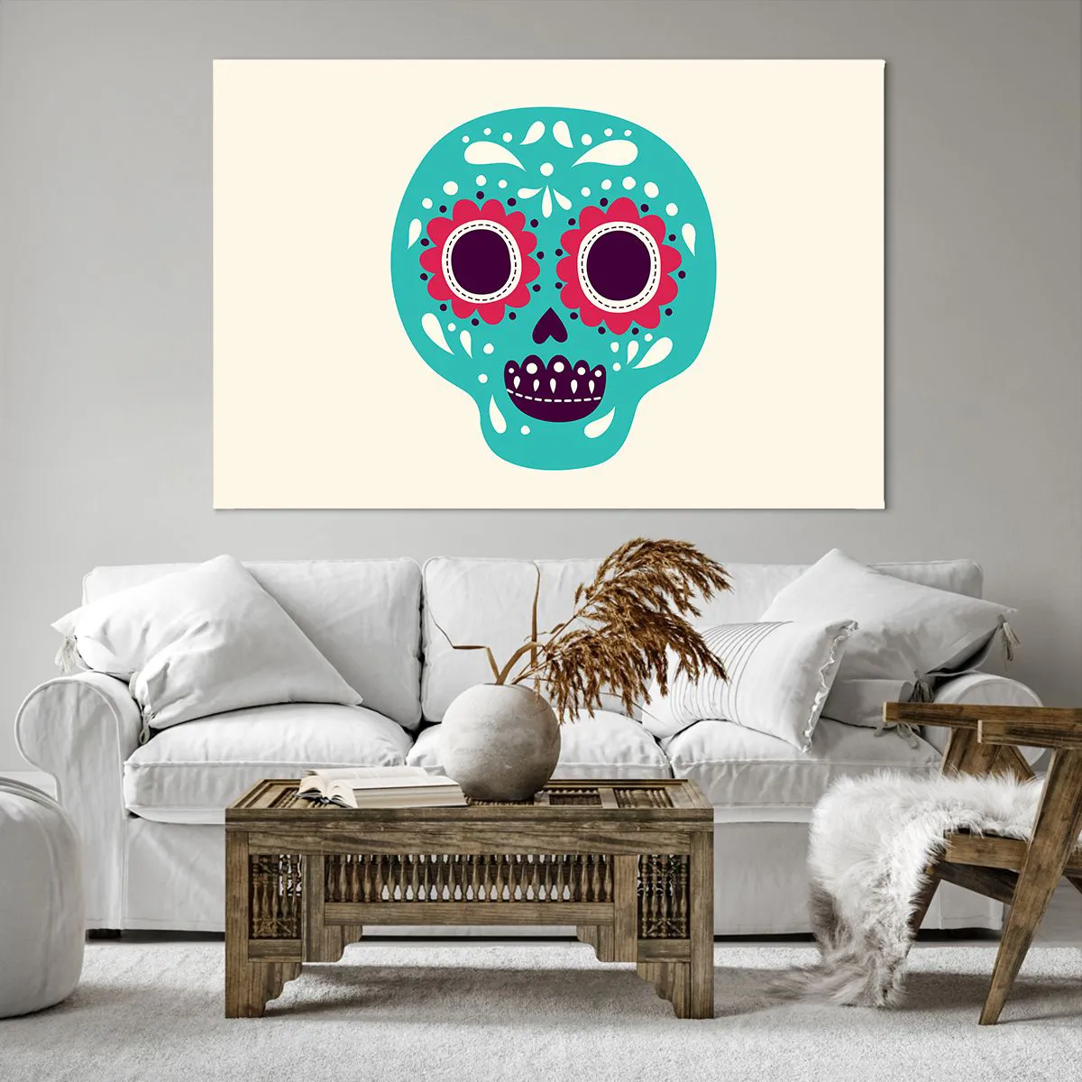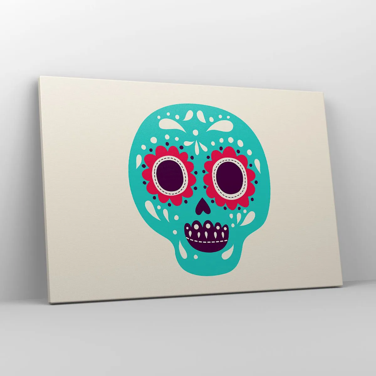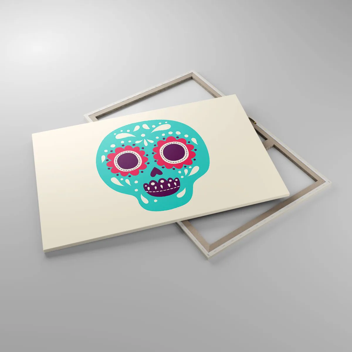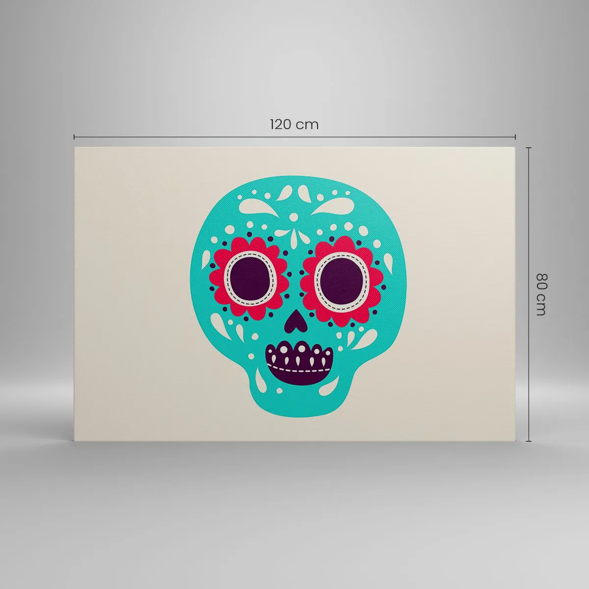Bild auf Leinwand - Leinwandbild - Ein türkis-violetter Zuckerschädel, inspiriert von der mexikanischen Kultur - 120x80cm - Das Leben – Spaß bis zum Tod - Moderne Wanddekoration für Wohnzimmer und Schlafzimmer ARTTOR