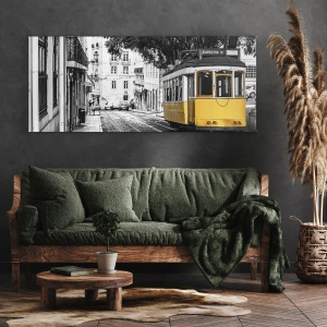 Bild auf Leinwand - Leinwandbild - Eine gelbe Straßenbahn vor dem Hintergrund einer schwarz-weißen Straße - 120x80cm - Und Fado im Hintergrund - Moderne Wanddekoration für Wohnzimmer und Schlafzimmer ARTTOR