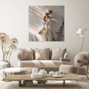 Bild auf Leinwand - Leinwandbild - Eine Frau im Boho-Stil, beleuchtet von den Sonnenstrahlen - 50x70cm - Die Sonne und das Mädchen - Moderne Wanddekoration für Wohnzimmer und Schlafzimmer ARTTOR