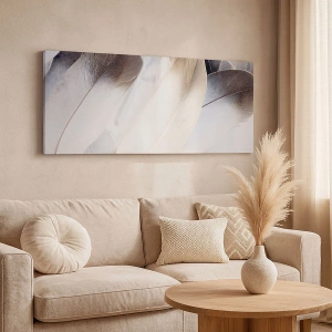 - Das Gemälde zeigt eine Nahaufnahme zarter Federn in Weiß- und Grautönen. Eine minimalistische Dekoration, die jedem Interieur Subtilität und Eleganz verleiht.