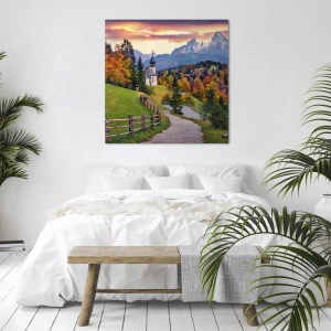 Bild auf Leinwand - Leinwandbild - Herbstliche Berglandschaft mit Kapelle und Sonnenuntergang - 160x50cm - Landschaftsartige Malerei - Moderne Wanddekoration für Wohnzimmer und Schlafzimmer ARTTOR