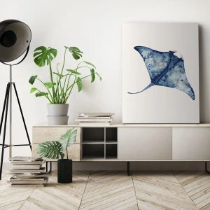 Dank seiner minimalistischen Komposition und harmonischen Farben verleiht das Gemälde Innenräumen eine ruhige, tropische Atmosphäre. Der Blauton des Stachelrochens auf weißem Hintergrund betont Eleganz und Frische und macht dieses Motiv ideal für Wohnzimmer, Schlafzimmer oder Büros.