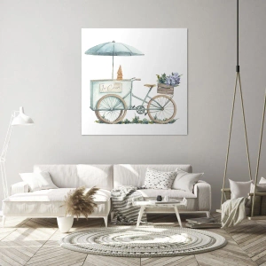 Wandbild – Süße Sommererinnerungen – Fahrrad mit Eiscreme und Blumen unter einem Regenschirm