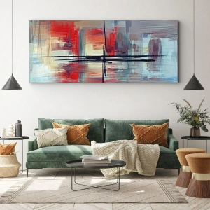 Das Gemälde „Landschaft in einer unbekannten Dimension“ ist ein einzigartiges abstraktes Kunstwerk, das mit seinen intensiven Farben und dynamischen Linien den Blick auf sich zieht. Die dominanten Rot-, Blau- und Beigetöne harmonieren harmonisch und erzeugen ein Gefühl von Bewegung und Tiefe. Geometrische Formen und kontrastierende Linien verleihen der Komposition einen modernen Charakter.