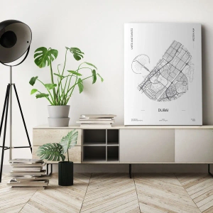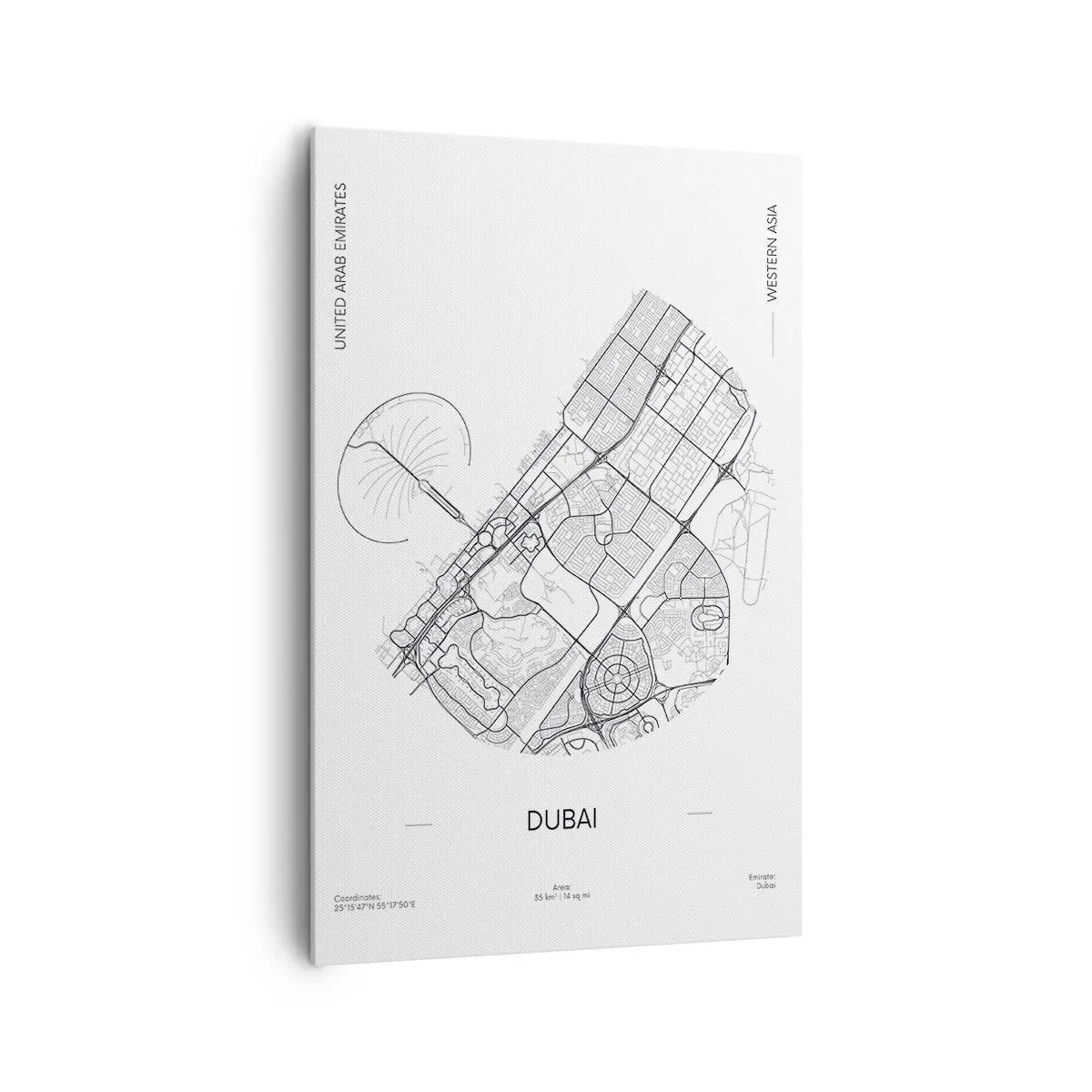 Bild auf Leinwand - Leinwandbild - Eine minimalistische Schwarzweißkarte von Dubai mit Standortmarkierungen. - 80x120cm - Anatomie von Dubai - Moderne Wanddekoration für Wohnzimmer und Schlafzimmer ARTTOR