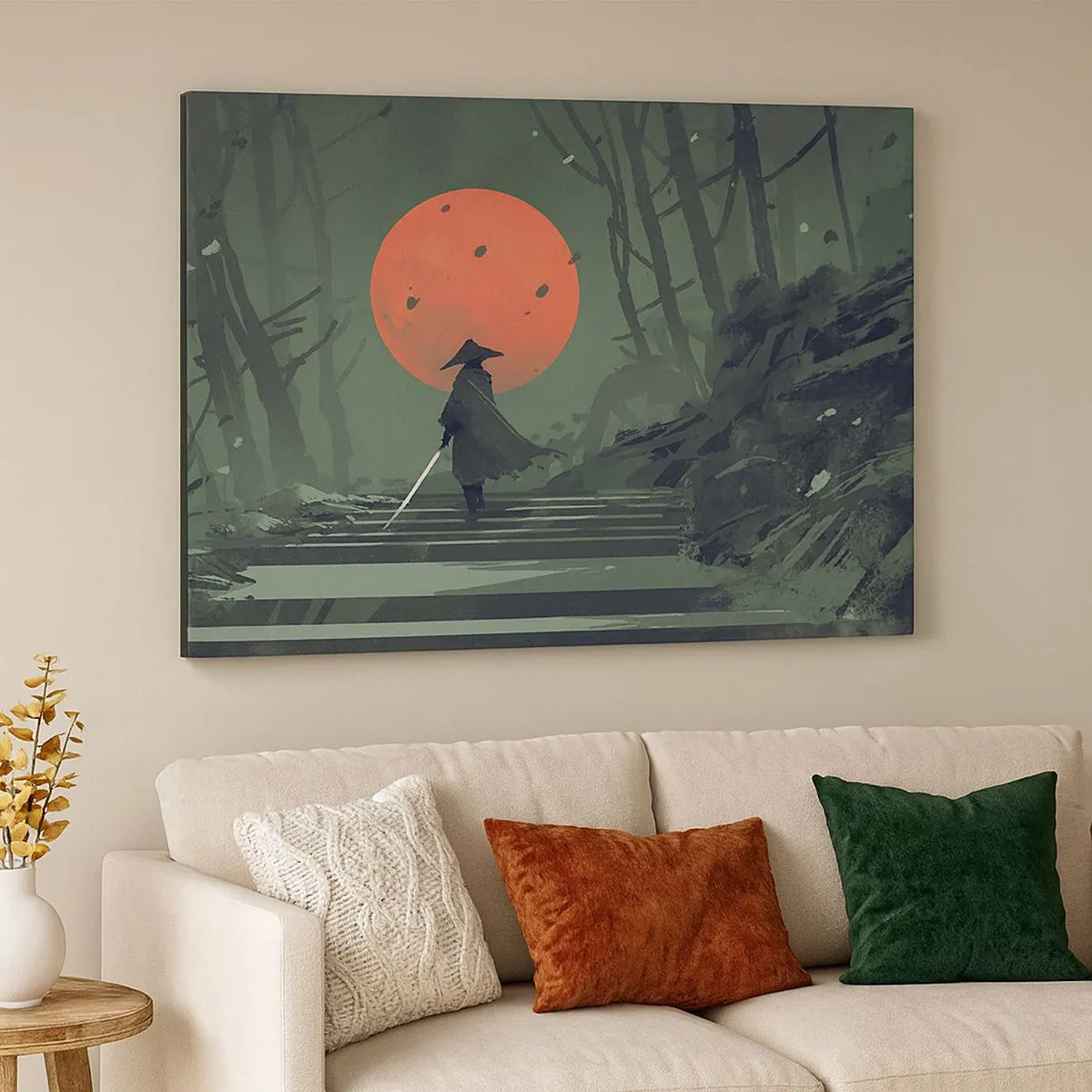 Bild auf Leinwand - Leinwandbild - Ein einsamer Krieger mit einem Schwert vor dem Hintergrund eines roten Mondes in einem dunklen Wald. - 100x70cm - Krieger des Roten Mondes - Moderne Wanddekoration für Wohnzimmer und Schlafzimmer ARTTOR