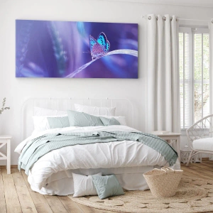 Bild auf Leinwand - Leinwandbild - Ein zarter blauer Schmetterling auf einem Stängel in violettem Licht - 100x70cm - Ein Juwel der Natur - Moderne Wanddekoration für Wohnzimmer und Schlafzimmer ARTTOR