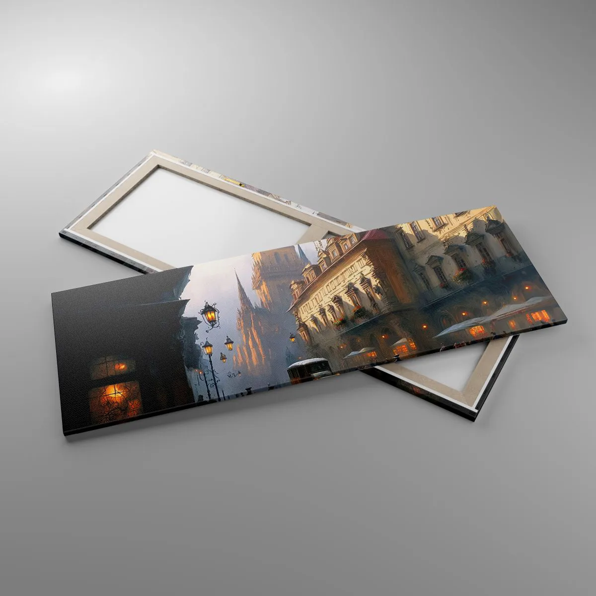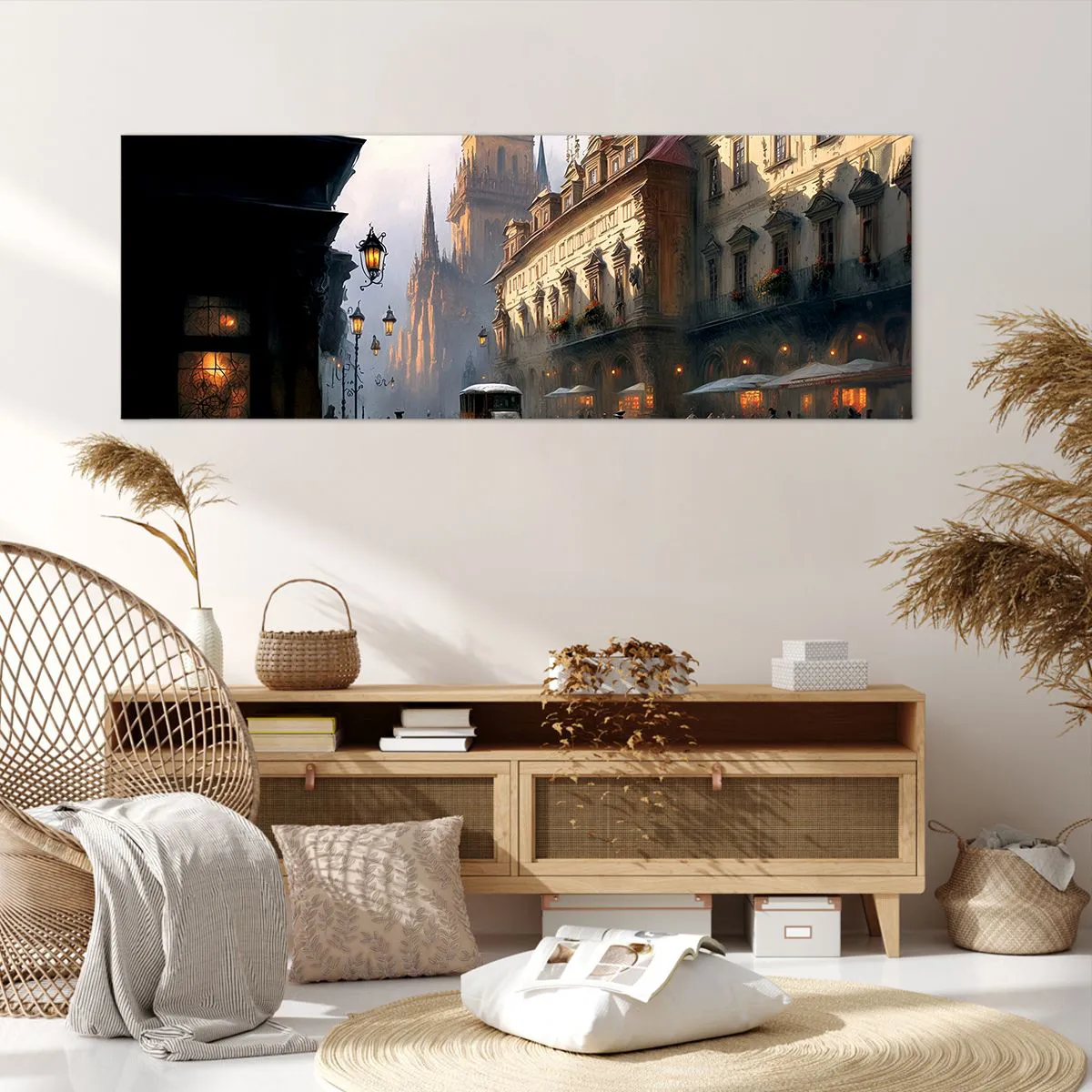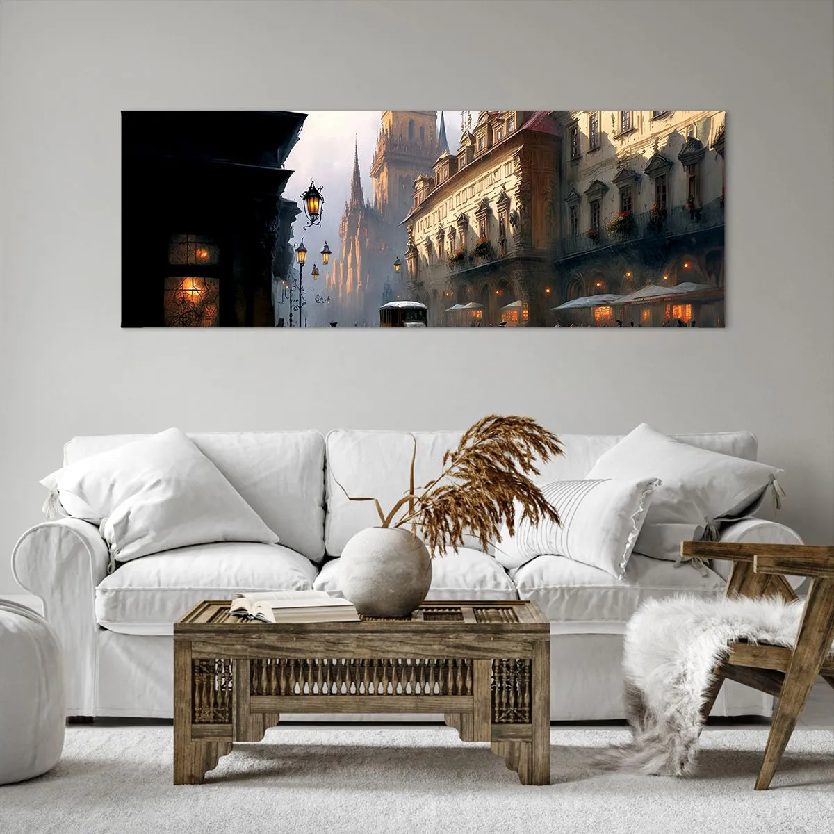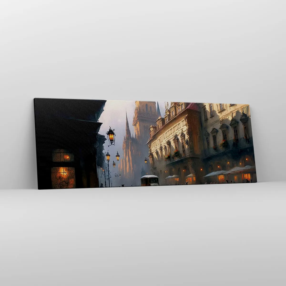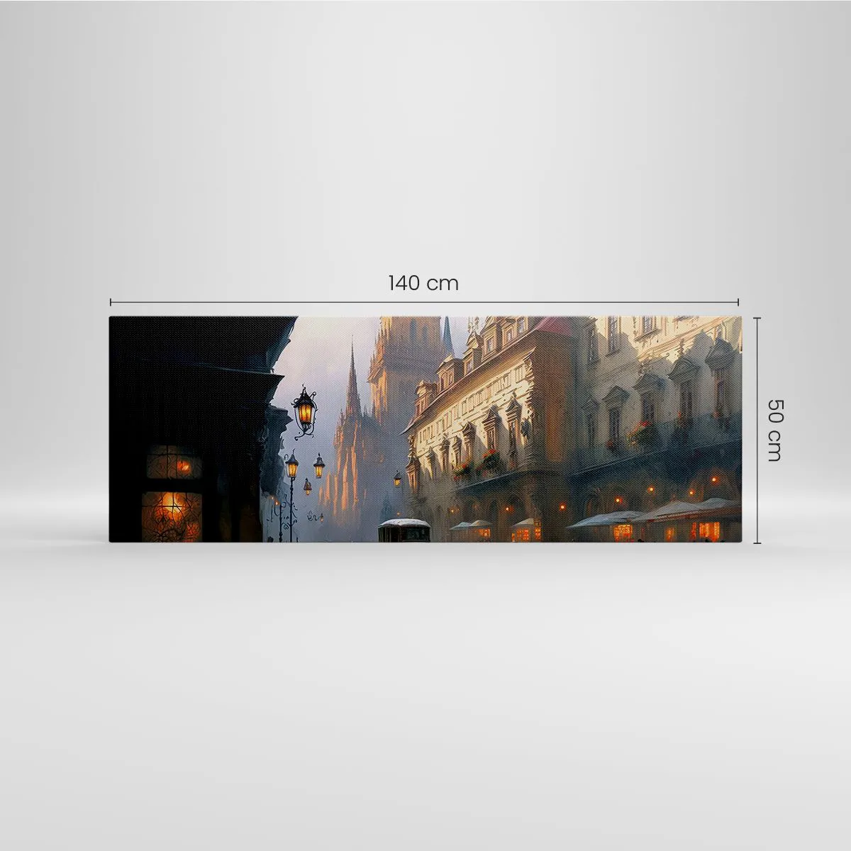 Bild auf Leinwand - Leinwandbild - Abendliche Straßenszene mit historischer Architektur - 140x50cm - Charme eines Prager Abends - Moderne Wanddekoration für Wohnzimmer und Schlafzimmer ARTTOR