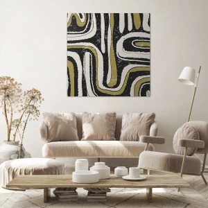 Das Leinwandbild Komposition: Wege und Gassen ist ein einzigartiges Werk, das minimalistisches Design mit einem unverwechselbaren Stil verbindet. Das zentrale Motiv ist ein abstraktes Muster mit Linien in Schwarz-, Weiß- und Gold-Tönen, die einem Labyrinth voller geheimnisvoller Gassen ähneln. Die Harmonie kontrastierender Farben und geometrischer Formen schafft eine dynamische Komposition, die dem Interieur Eleganz und Modernität verleiht.