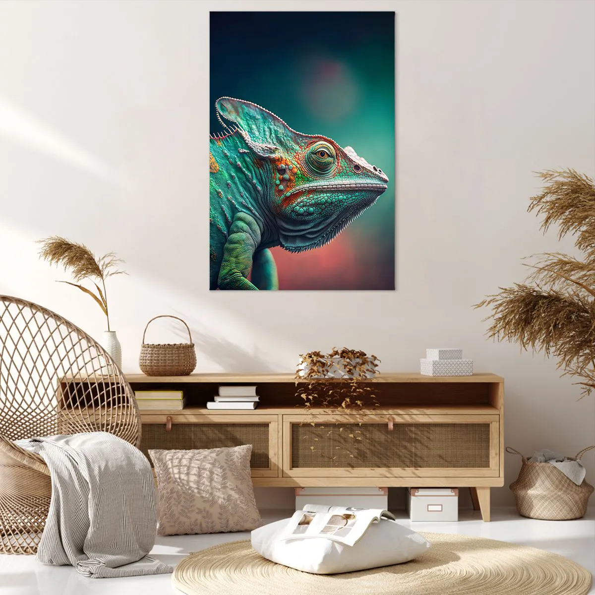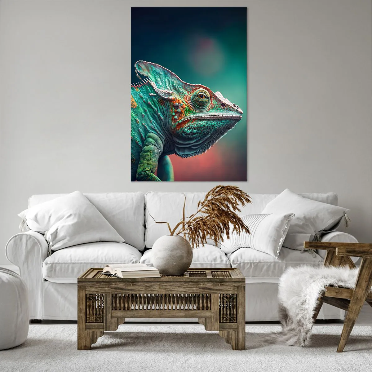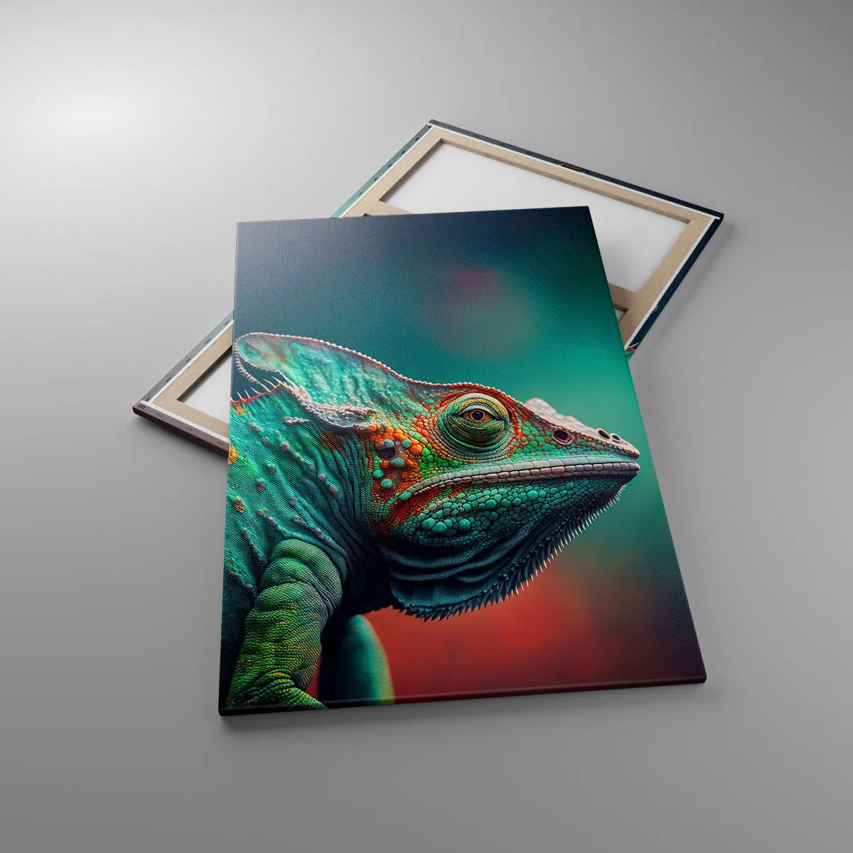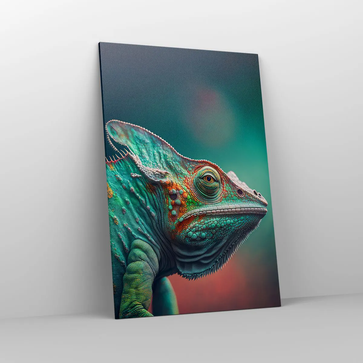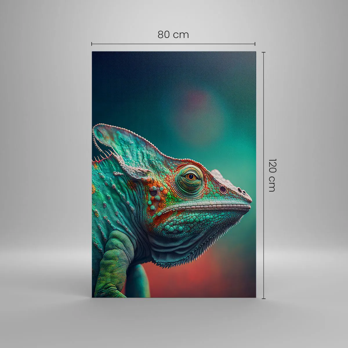 Bild auf Leinwand - Leinwandbild - Nahaufnahme eines Chamäleons in intensiven Farben - 80x120cm - Siehst du mich? Nicht gut… - Moderne Wanddekoration für Wohnzimmer und Schlafzimmer ARTTOR