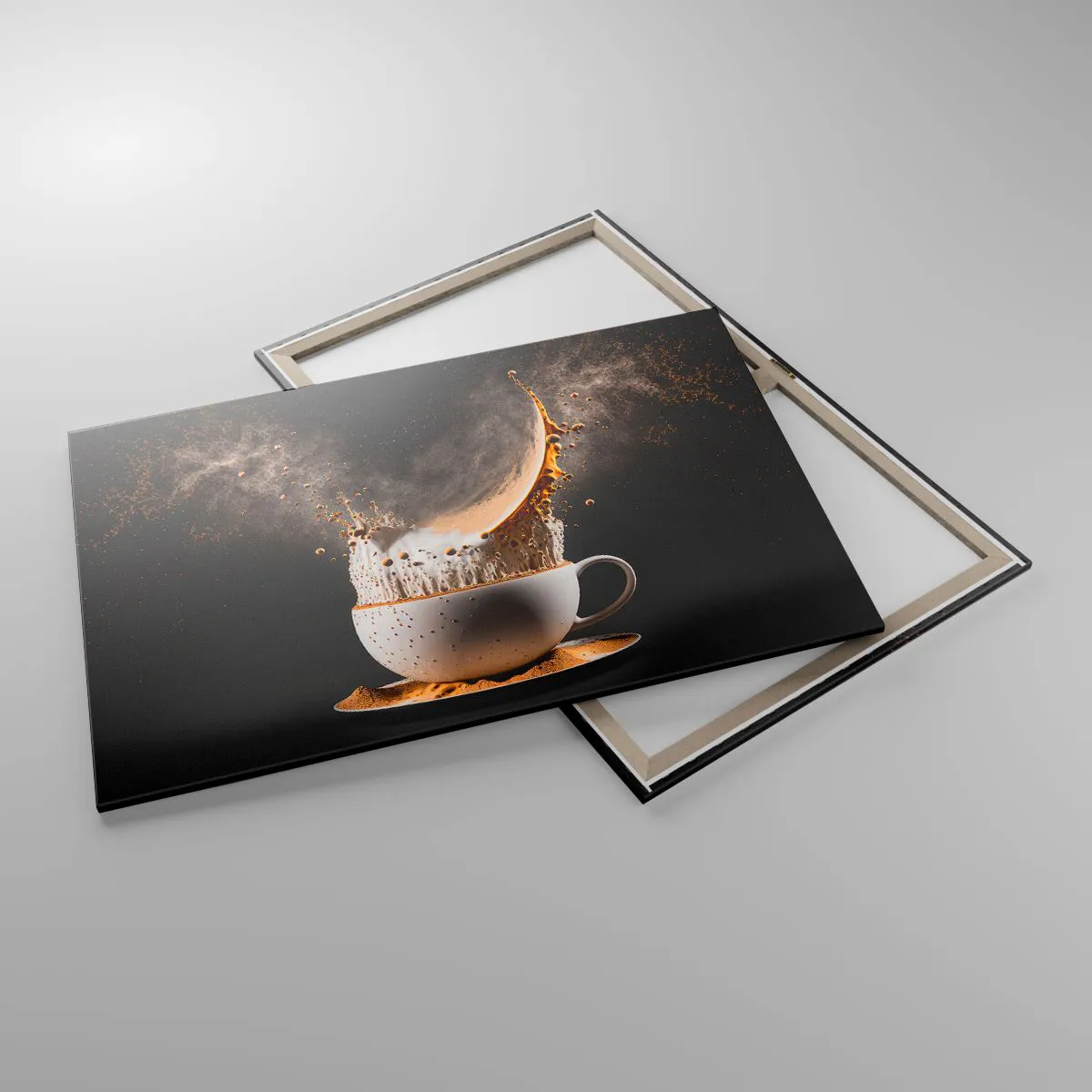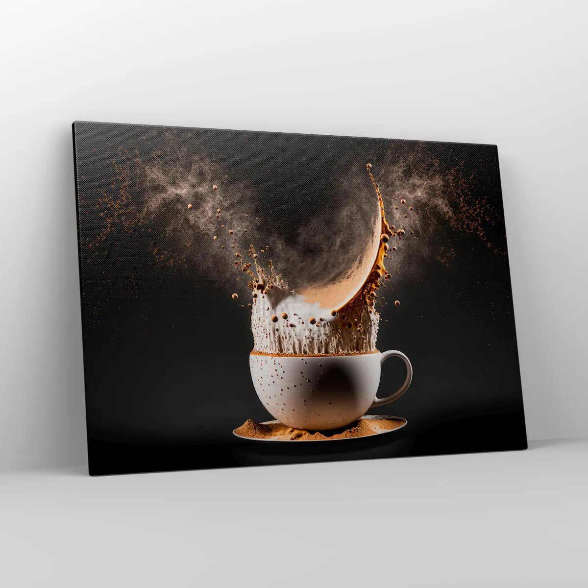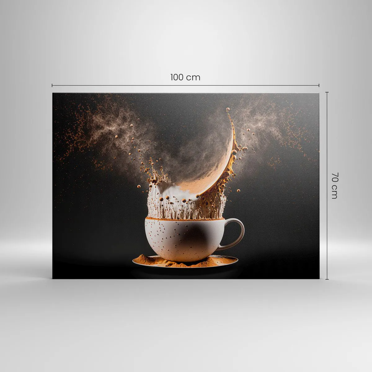 Bild auf Leinwand - Leinwandbild - Eine Tasse Kaffee mit einer dynamischen Flüssigkeitsexplosion auf schwarzem Hintergrund. - 100x70cm - Geschmacksexplosion - Moderne Wanddekoration für Wohnzimmer und Schlafzimmer ARTTOR
