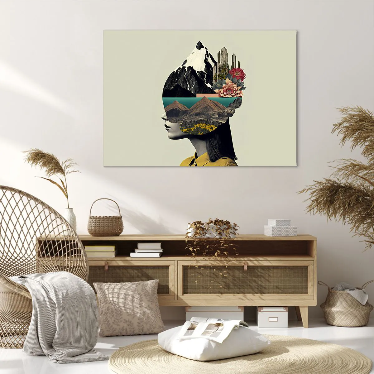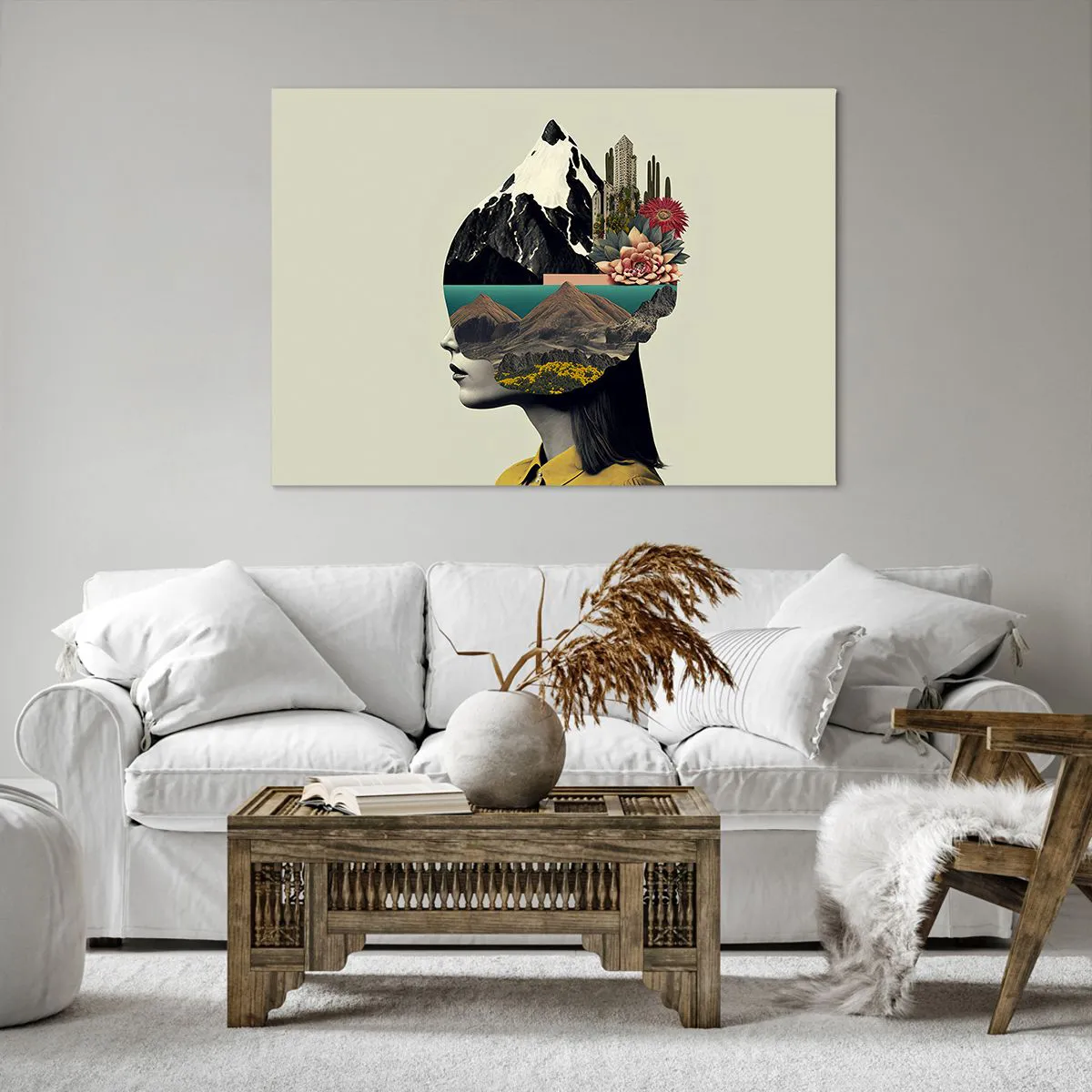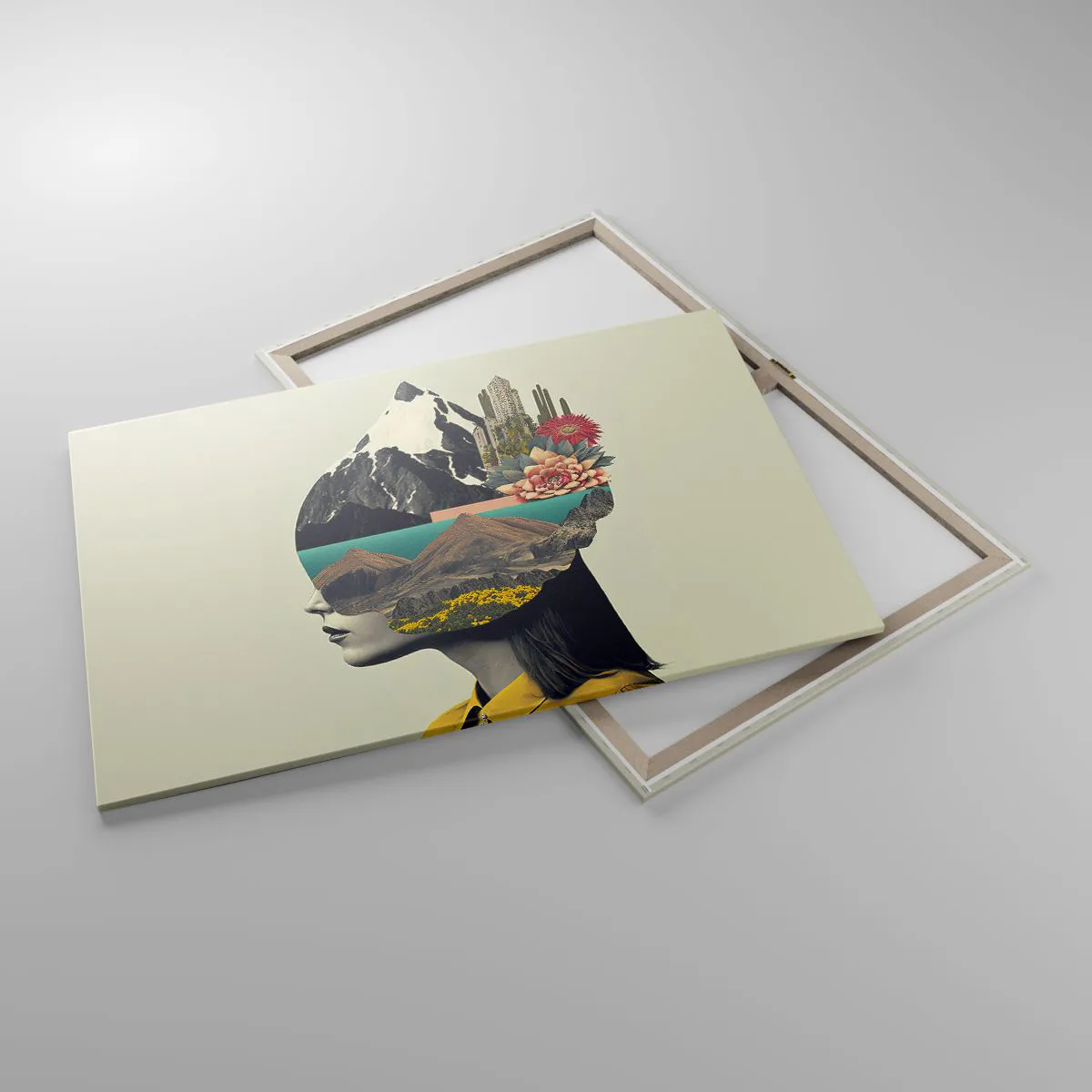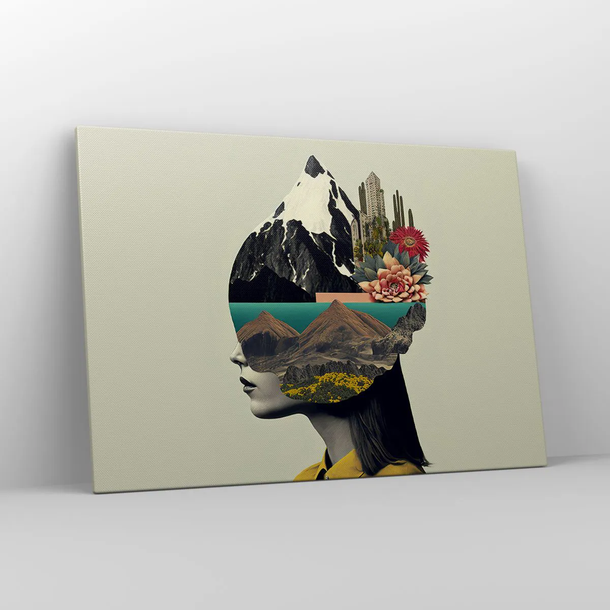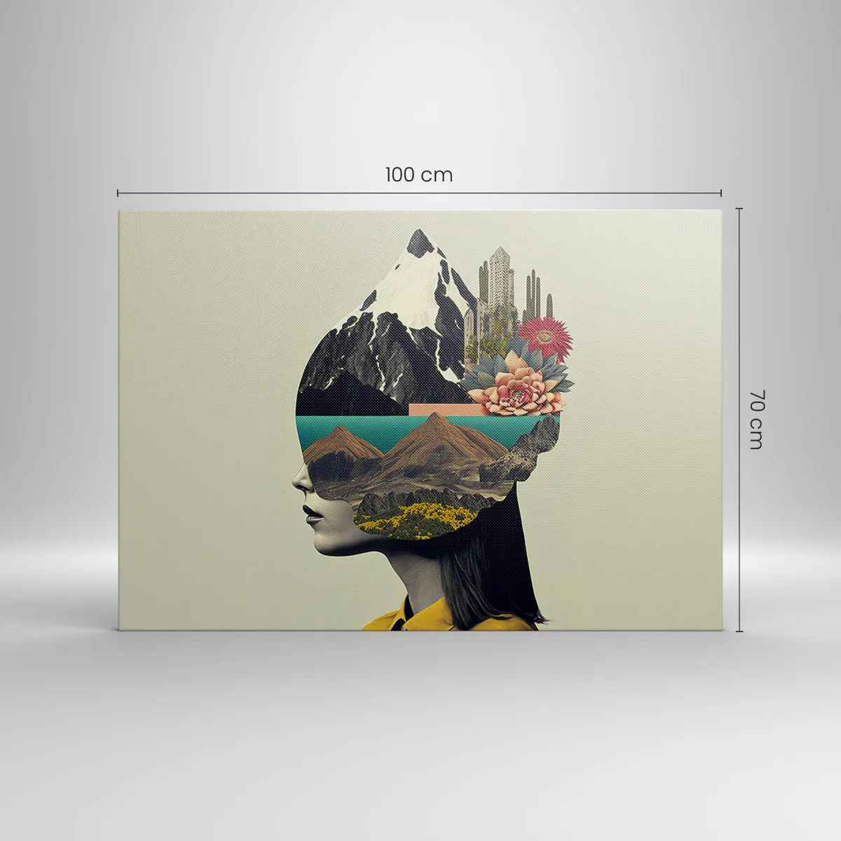 Bild auf Leinwand - Leinwandbild - Collage einer Frau mit Berglandschaft und Blumen - 100x70cm - Frau – bleibt immer ein Geheimnis - Moderne Wanddekoration für Wohnzimmer und Schlafzimmer ARTTOR