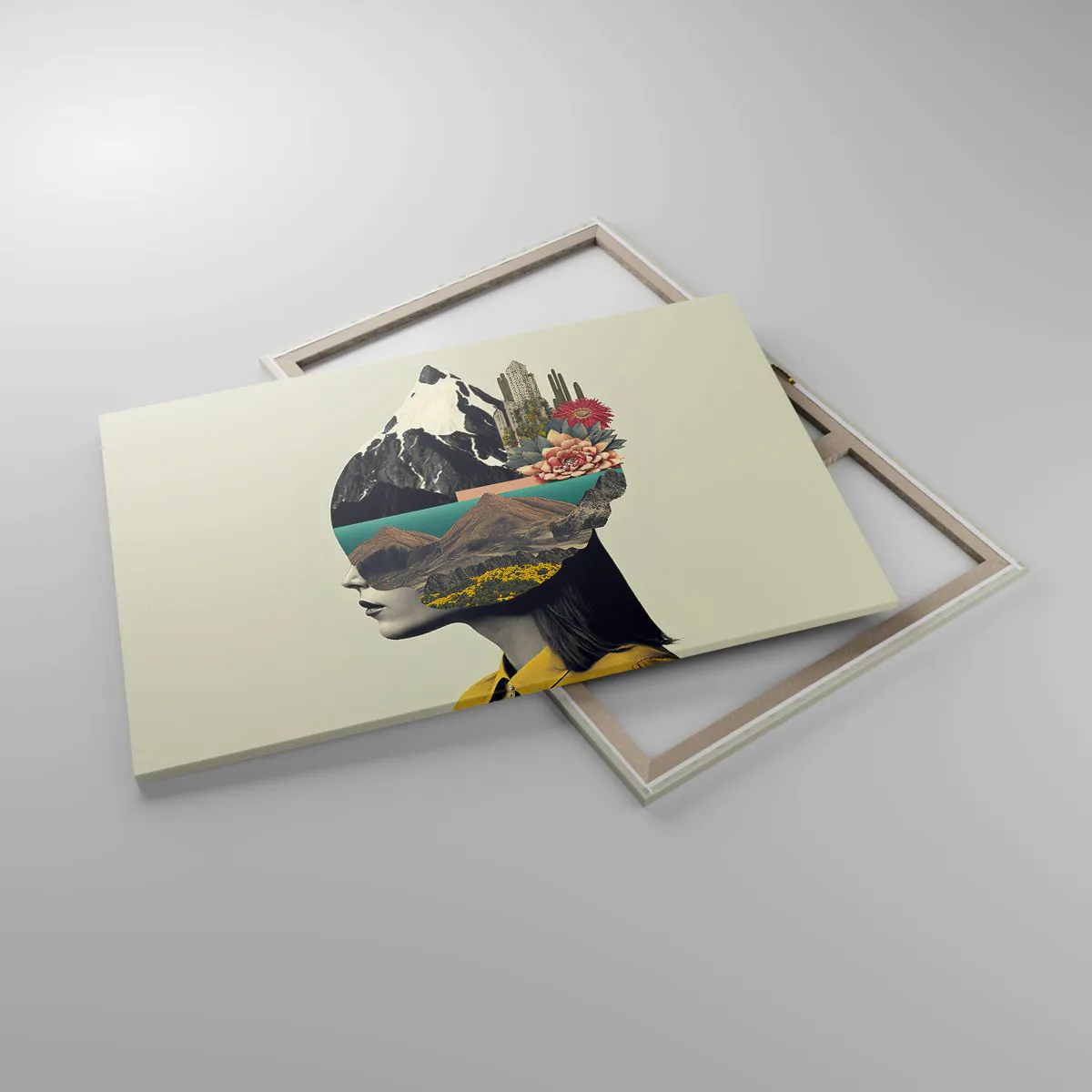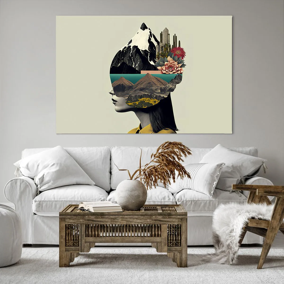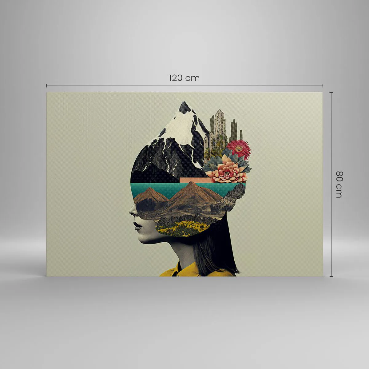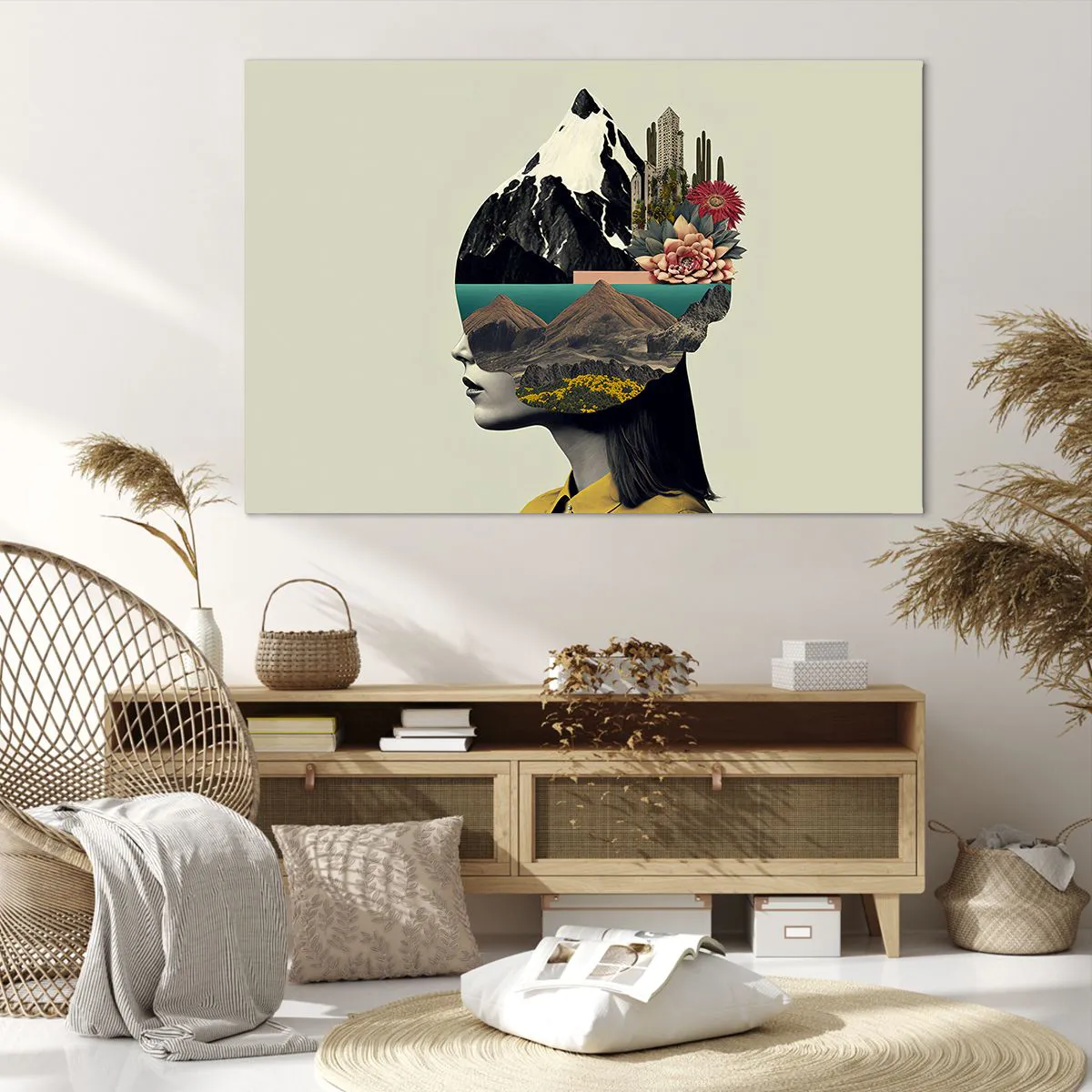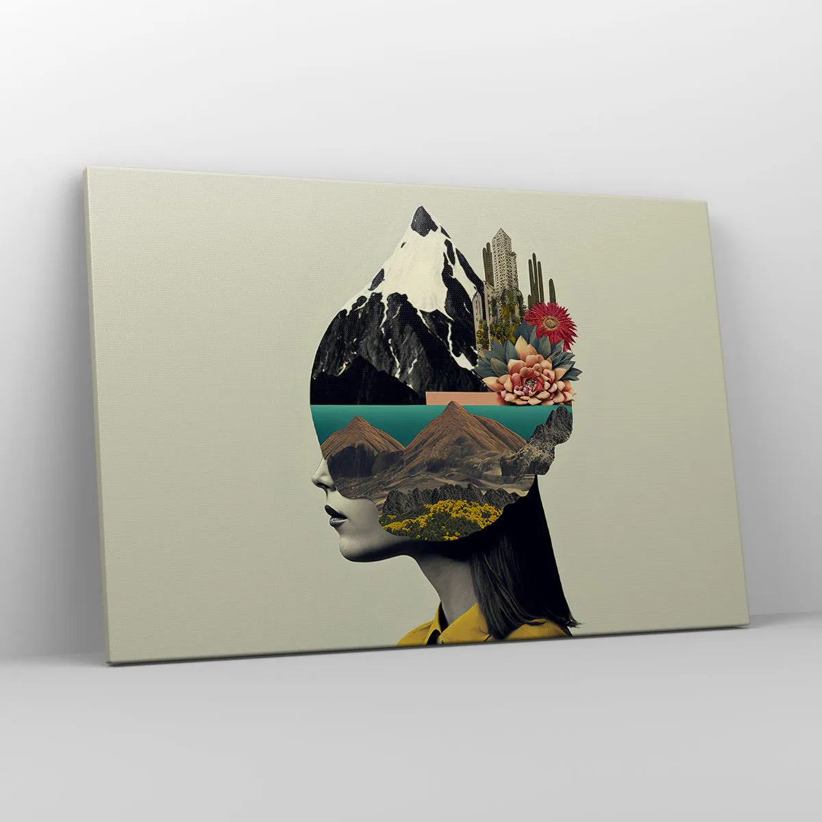 Bild auf Leinwand - Leinwandbild - Collage einer Frau mit Berglandschaft und Blumen - 120x80cm - Frau – bleibt immer ein Geheimnis - Moderne Wanddekoration für Wohnzimmer und Schlafzimmer ARTTOR