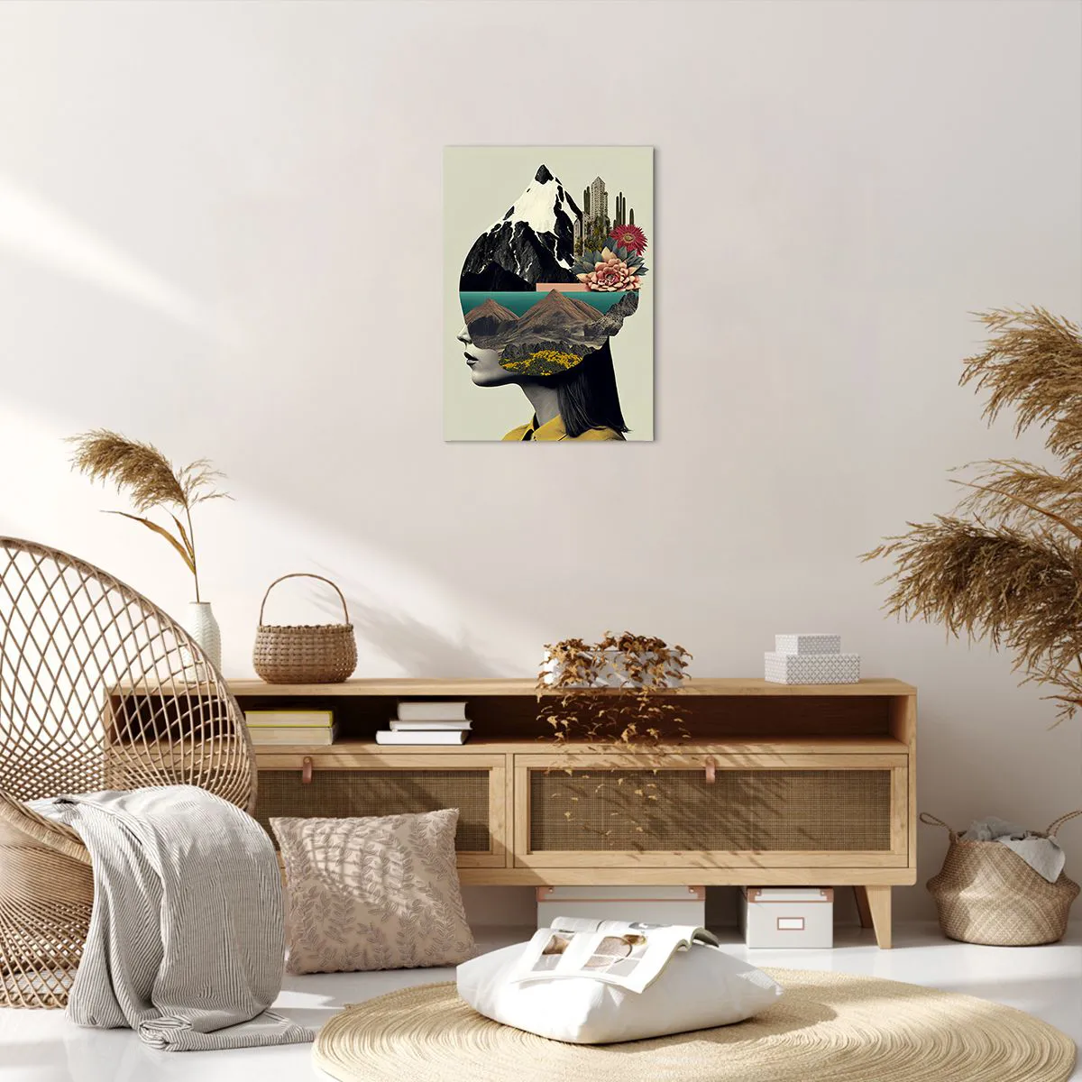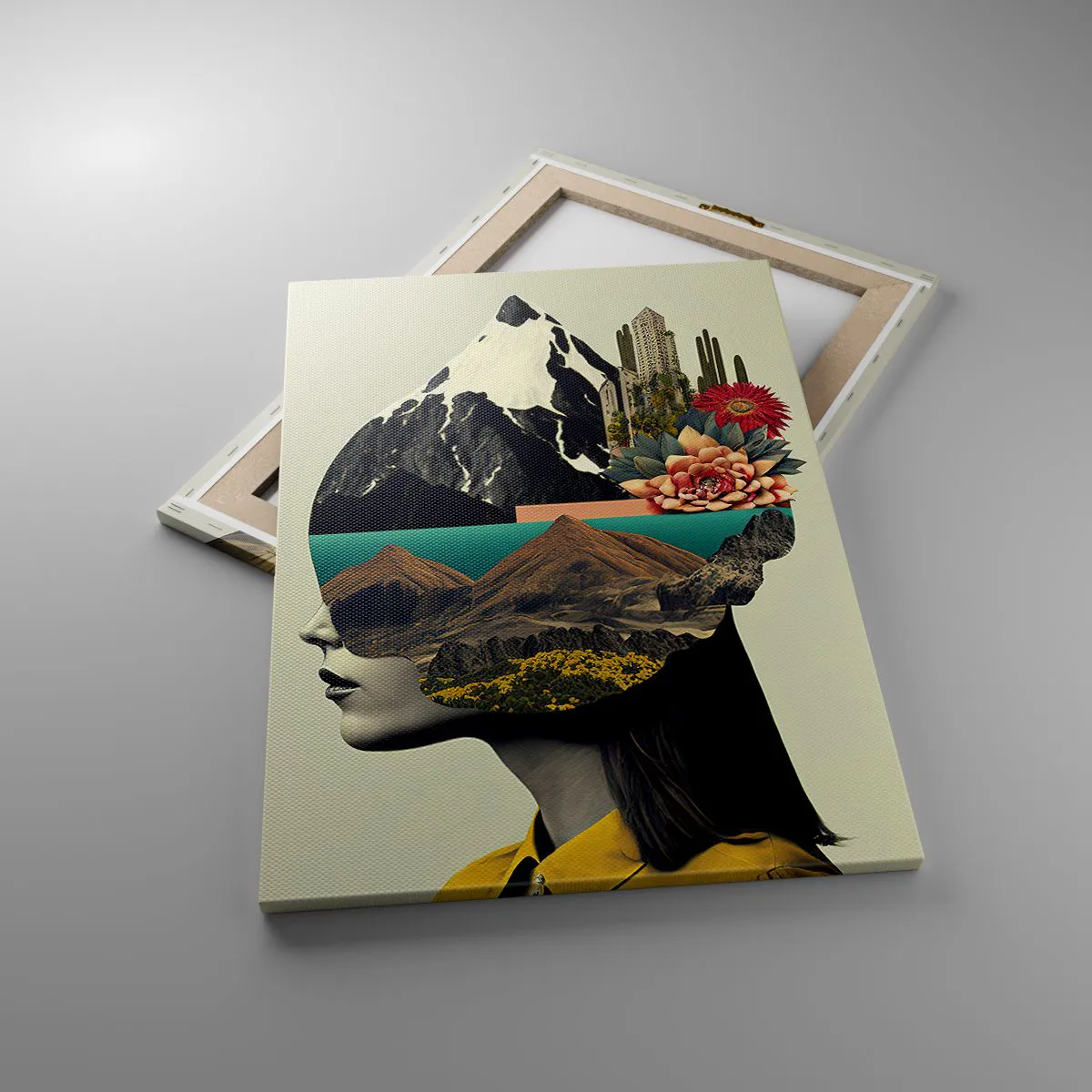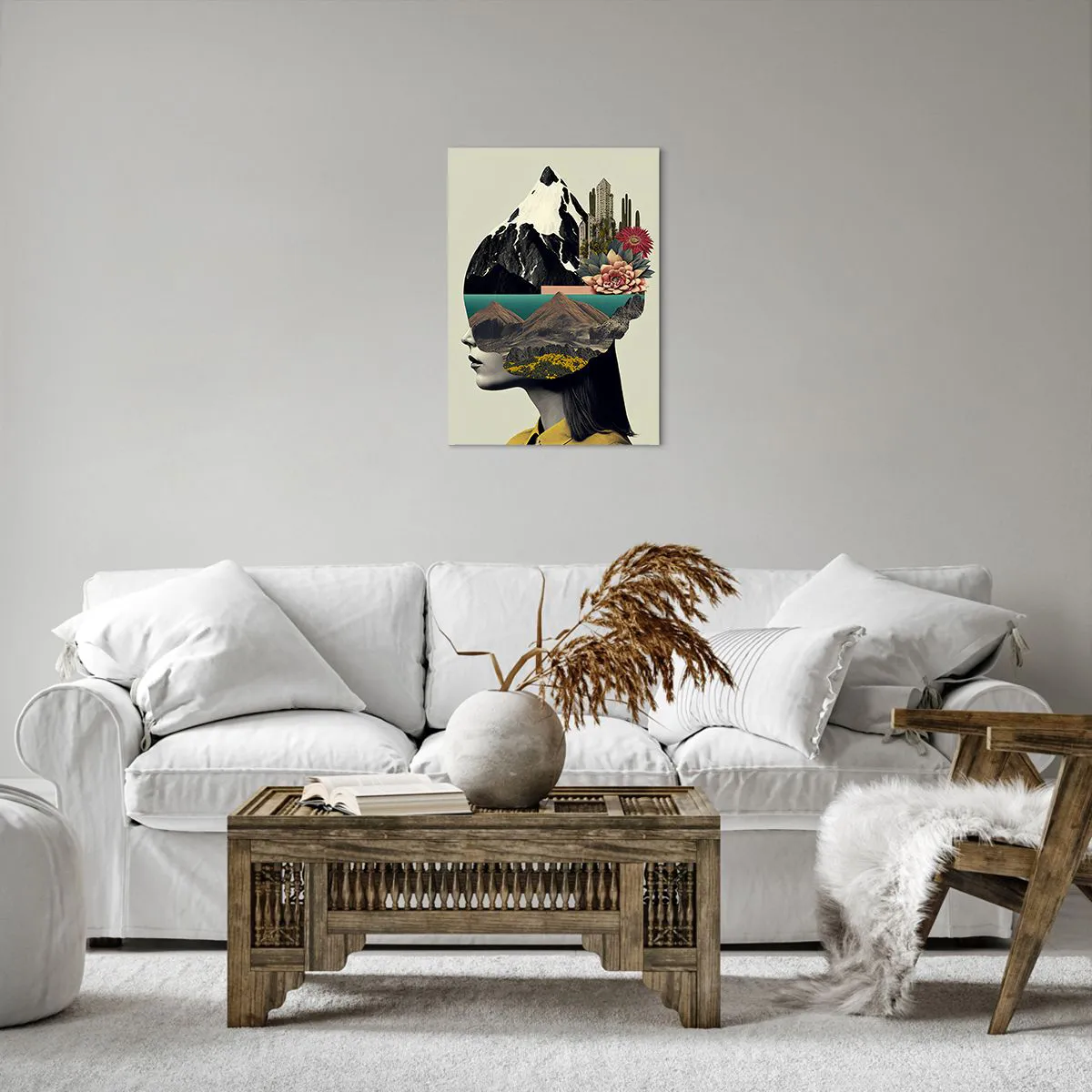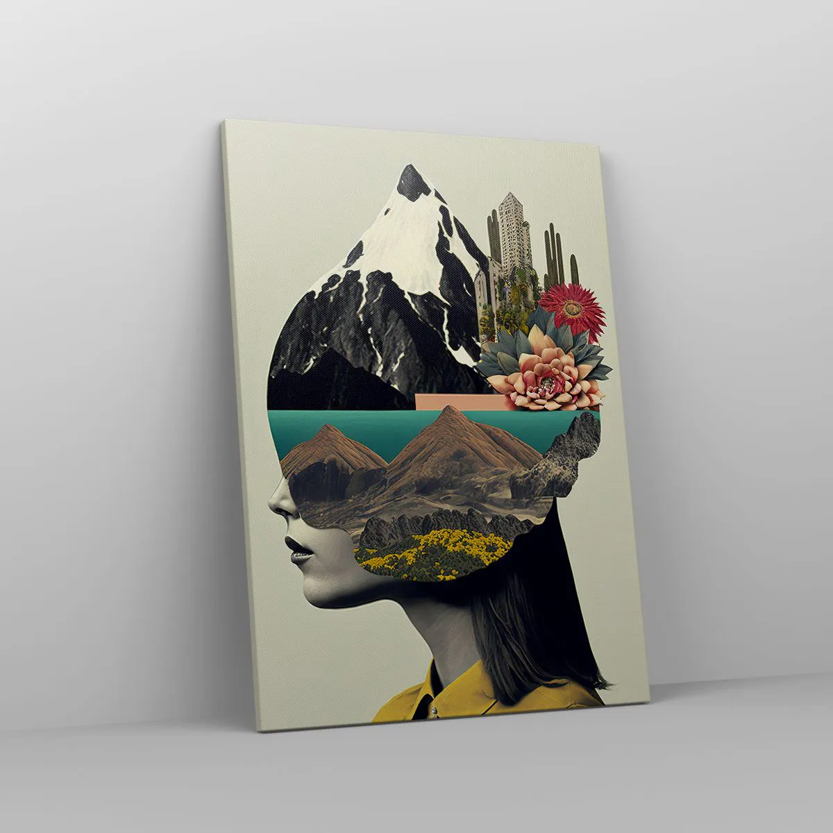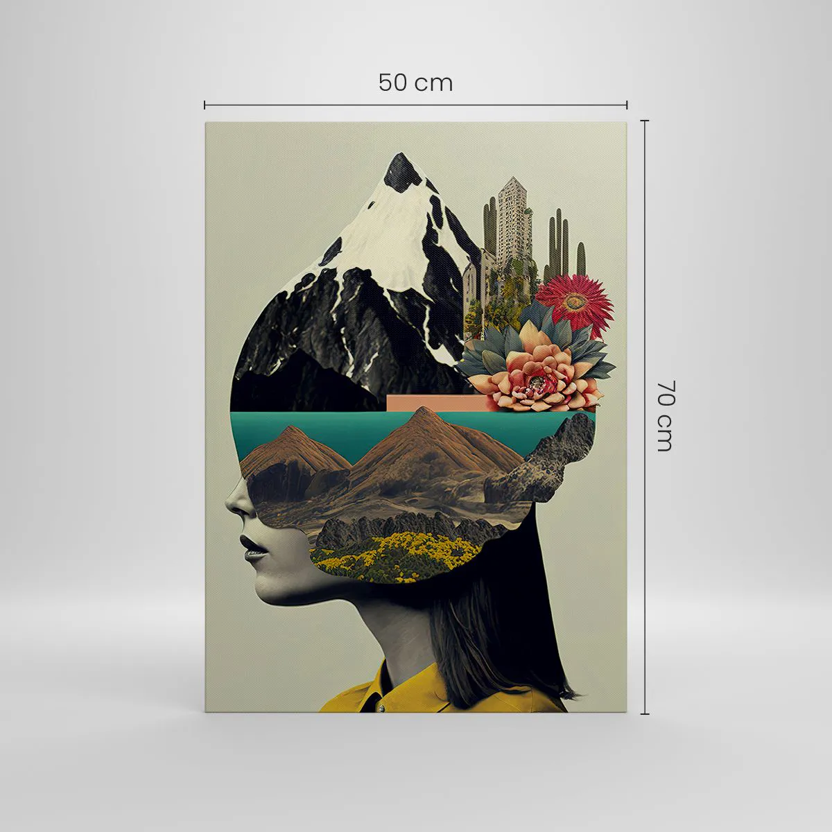 Bild auf Leinwand - Leinwandbild - Collage einer Frau mit Berglandschaft und Blumen - 50x70cm - Frau – bleibt immer ein Geheimnis - Moderne Wanddekoration für Wohnzimmer und Schlafzimmer ARTTOR