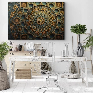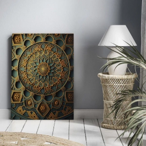 Bild auf Leinwand - Leinwandbild - Ein goldenes Mandala auf türkisfarbenem Hintergrund mit vielen Details. - 80x120cm - In arabischer Atmosphäre - Moderne Wanddekoration für Wohnzimmer und Schlafzimmer ARTTOR