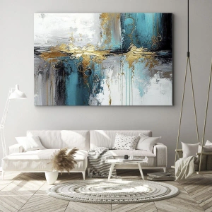 - Dieser 70 x 50 cm große Leinwanddruck zeigt eine abstrakte Komposition in Türkis- und Goldtönen. Eine perfekte Ergänzung für moderne und elegante Innenräume.