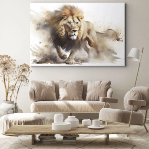 Bild auf Leinwand - Leinwandbild - Ein dynamisches Porträt eines Löwen in natürlichen Farben. - 70x50cm - Der König zog um - Moderne Wanddekoration für Wohnzimmer und Schlafzimmer ARTTOR