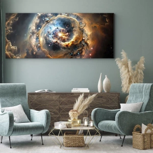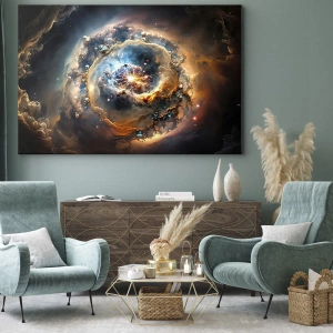 Die Leinwand wird über den Rahmen gespannt. Die Seiten und Kanten werden gedruckt, um das Bild fortzusetzen. Das Bild ist fertig zum Aufhängen an der Wand. Jedes Produkt hat einen am Rahmen befestigten Anhänger und ein Montageset (Schraube + Stift).