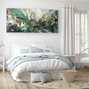 Die Farben des Gemäldes, die auf tiefen Grüntönen und goldenen Akzenten basieren, bringen Wärme und Raffinesse in den Innenraum. Subtile Details und dynamische Linien verleihen dem Werk Energie und bewahren gleichzeitig seinen minimalistischen Charakter.