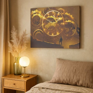 Bild auf Leinwand - Leinwandbild - Goldene Zahnräder in einer surrealen Umgebung mit einer Figur - 70x50cm - An der Quelle der Zeit - Moderne Wanddekoration für Wohnzimmer und Schlafzimmer ARTTOR