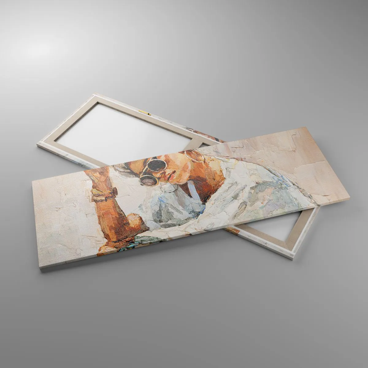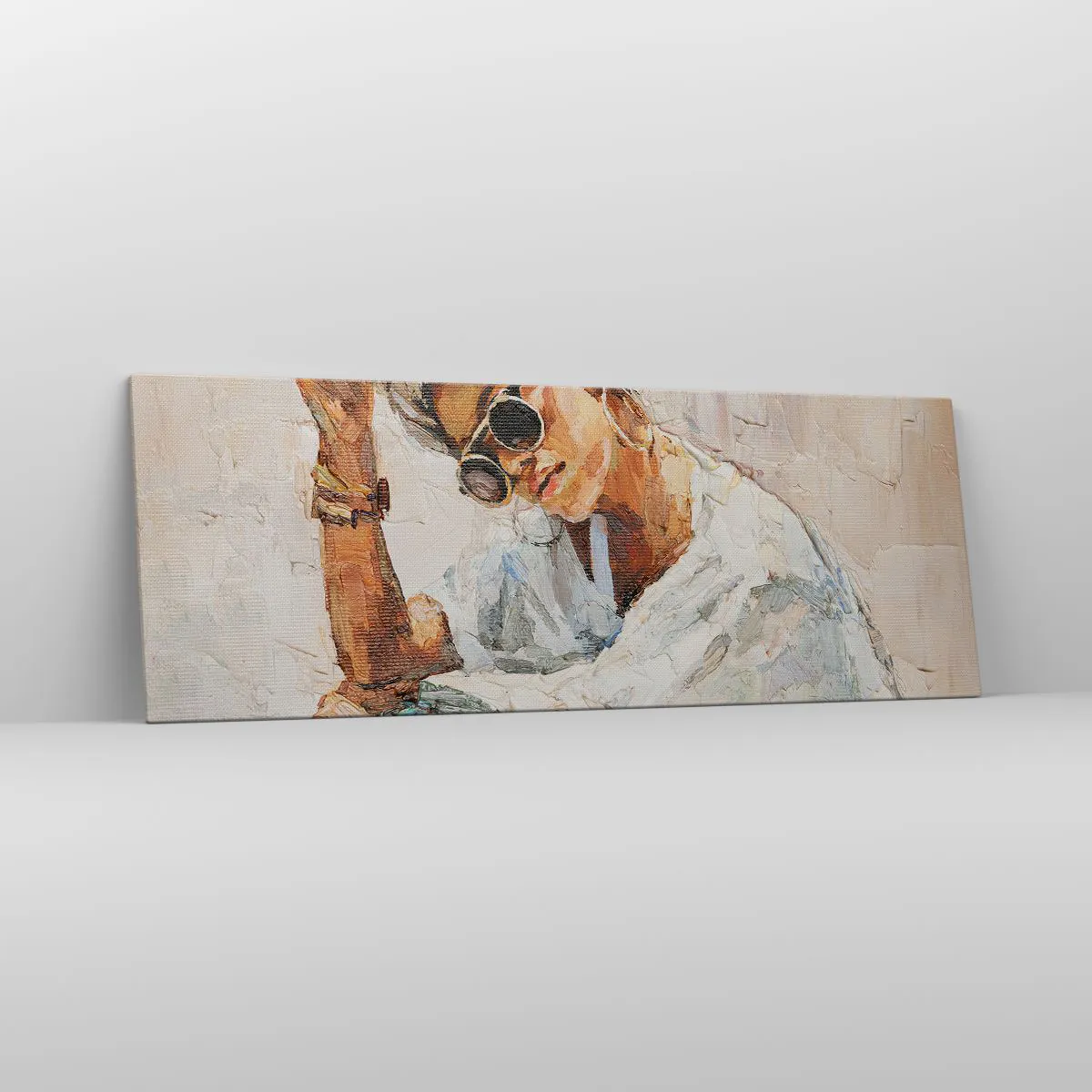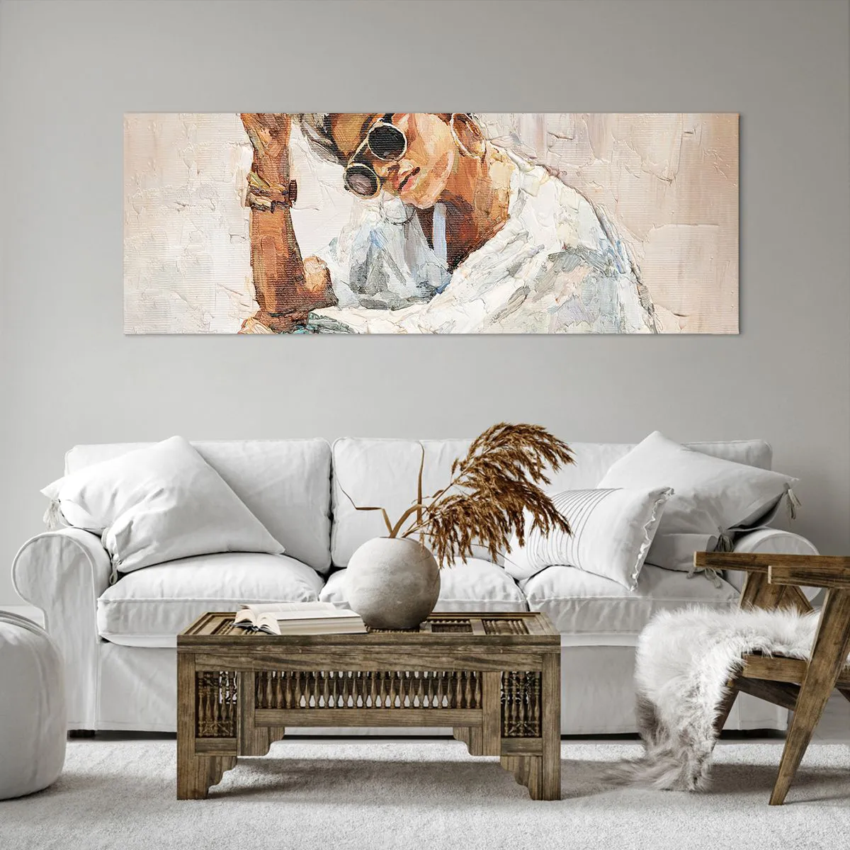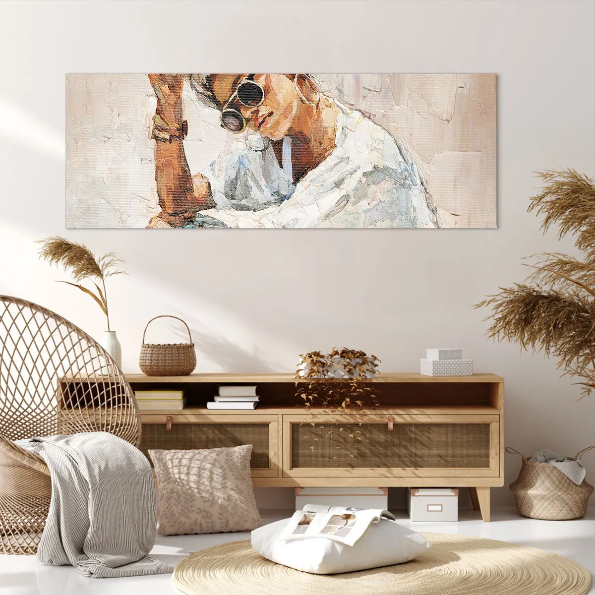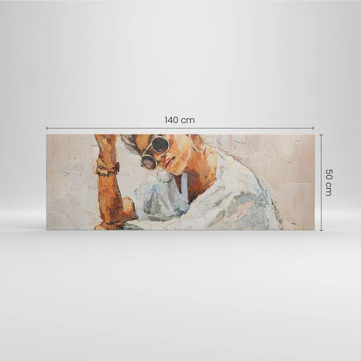 Bild auf Leinwand - Leinwandbild - Porträt einer Frau mit Sonnenbrille vor einer hellen Wand - 140x50cm - Porträt in voller Sonne - Moderne Wanddekoration für Wohnzimmer und Schlafzimmer ARTTOR
